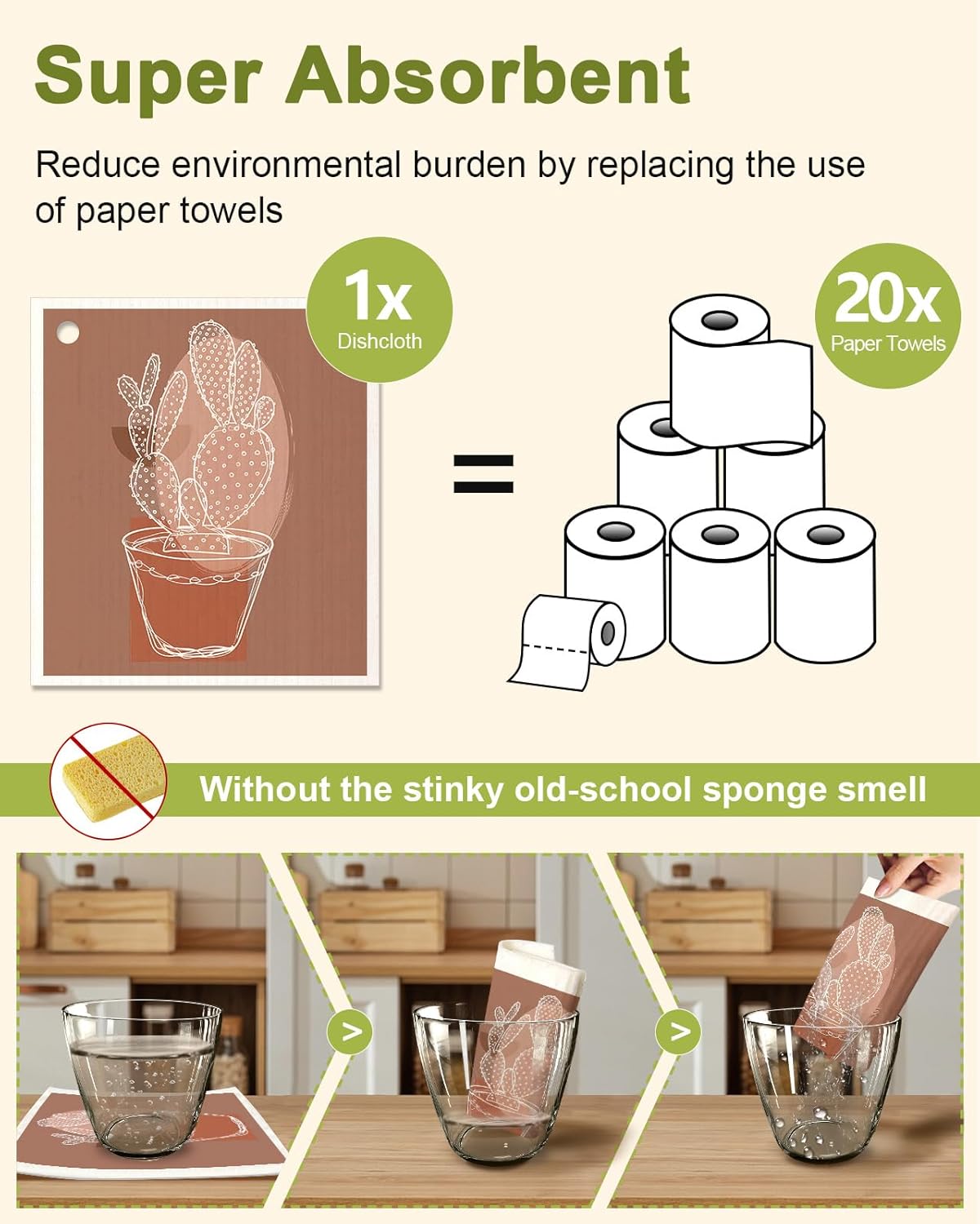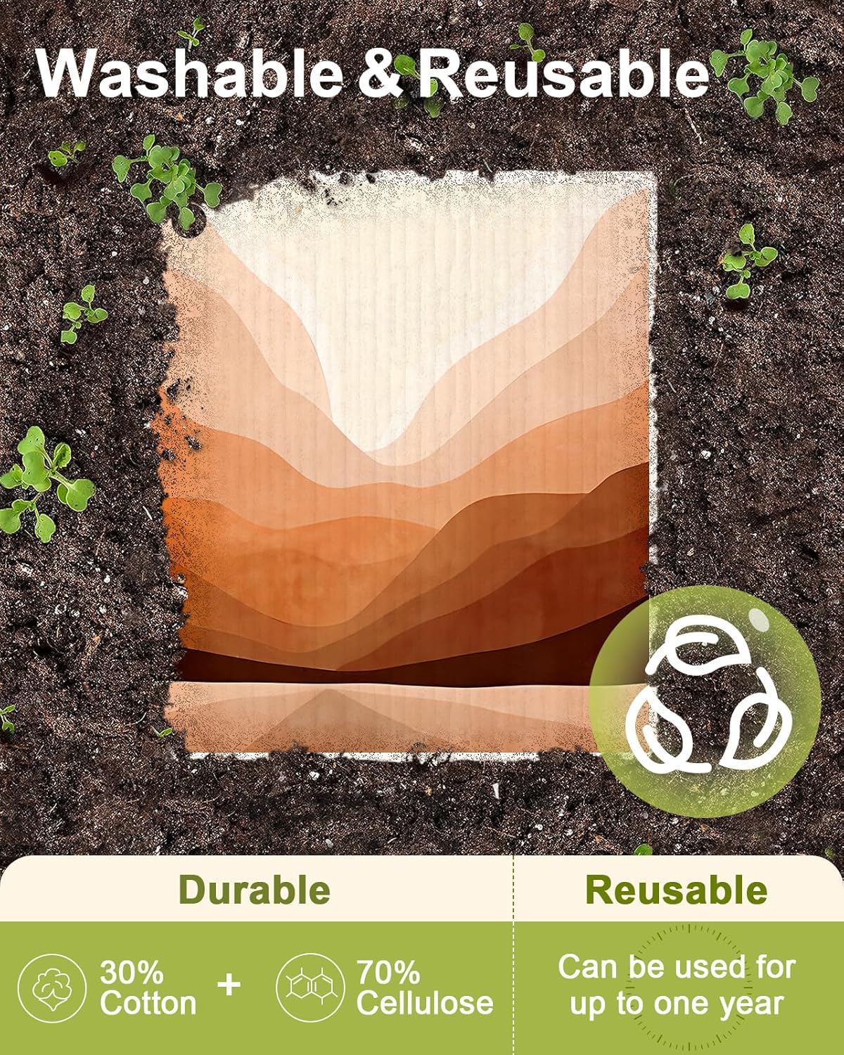 • REUSABLE: Our reusable swedish dish Cloths made of 30% cotton and 70% cellulose, fast drying and super absorbent, multiple cleaning projects around the kitchen and house
