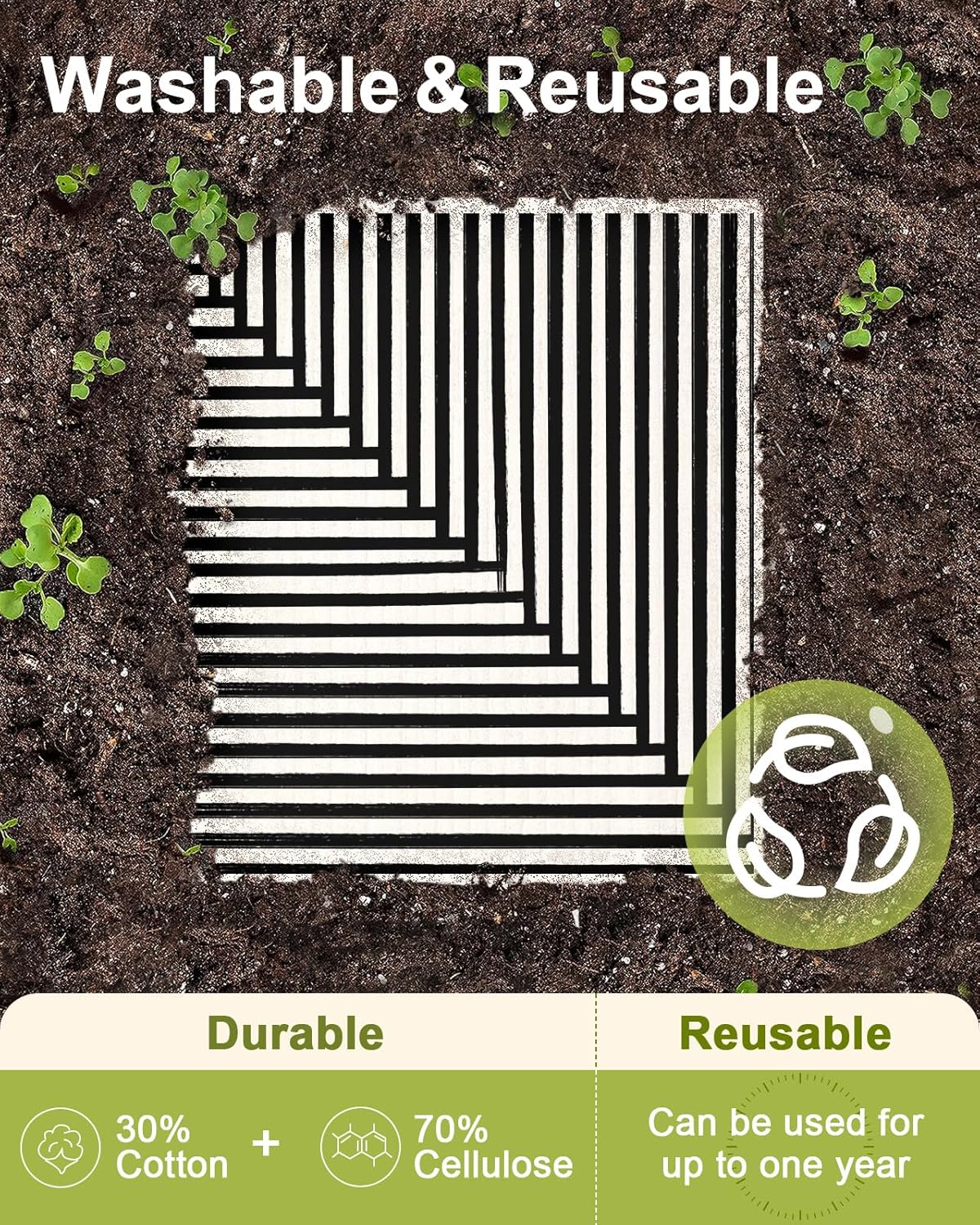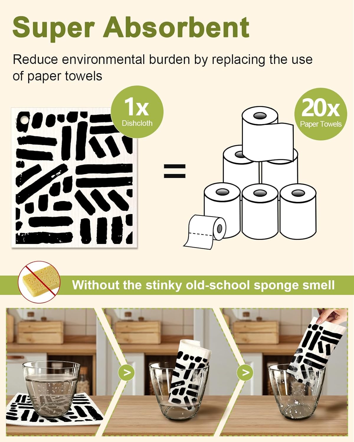 • REUSABLE: Our reusable swedish dish Cloths made of 30% cotton and 70% cellulose, fast drying and super absorbent, multiple cleaning projects around the kitchen and house