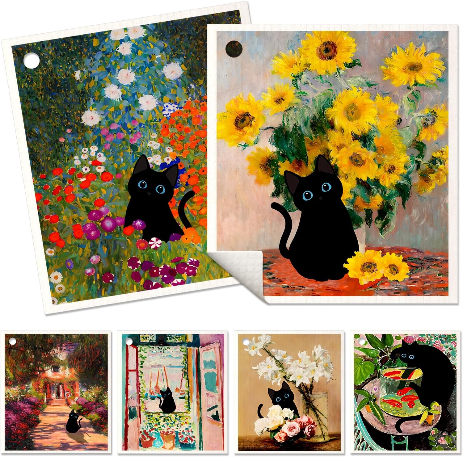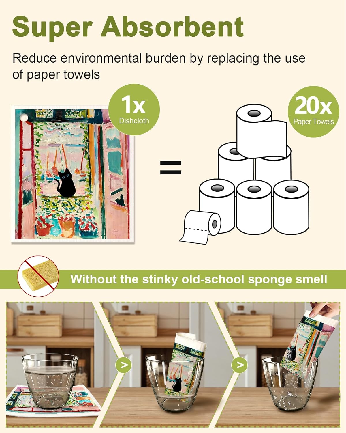6 Pack Swedish Dishcloths for Kitchen - Reusable Dish Cloths for Washing Dishes Absorbent Cute Funny Kitchen Towels Cleaning Sponge, Floral Cat