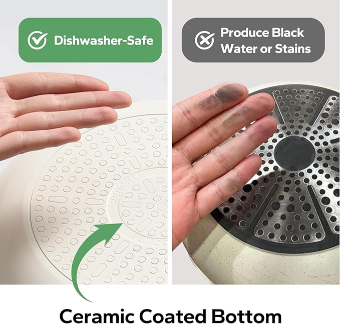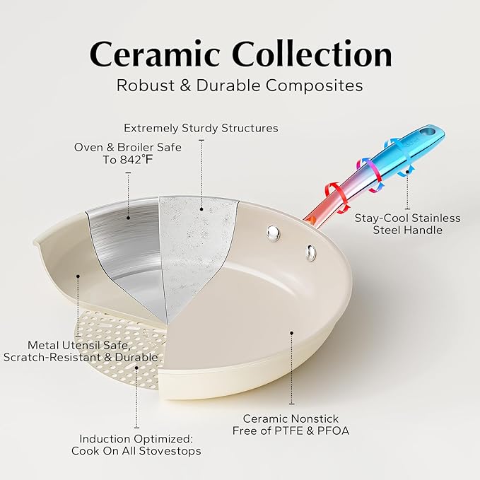 • EXCELLENT COMPATIBILITY: Versatility at its finest, our kitchen cookware, the ceramic nonstick frying pan is designed to thrive in any kitchen and on any cooktop. Whether you're cooking on induction, gas, or electric stovetops, this ceramic skillet performs with excellence. Plus, it's oven-safe, with both the handle and nonstick coating able to withstand temperatures of up to 842 °F, surpassing the capabilities of traditional cookware