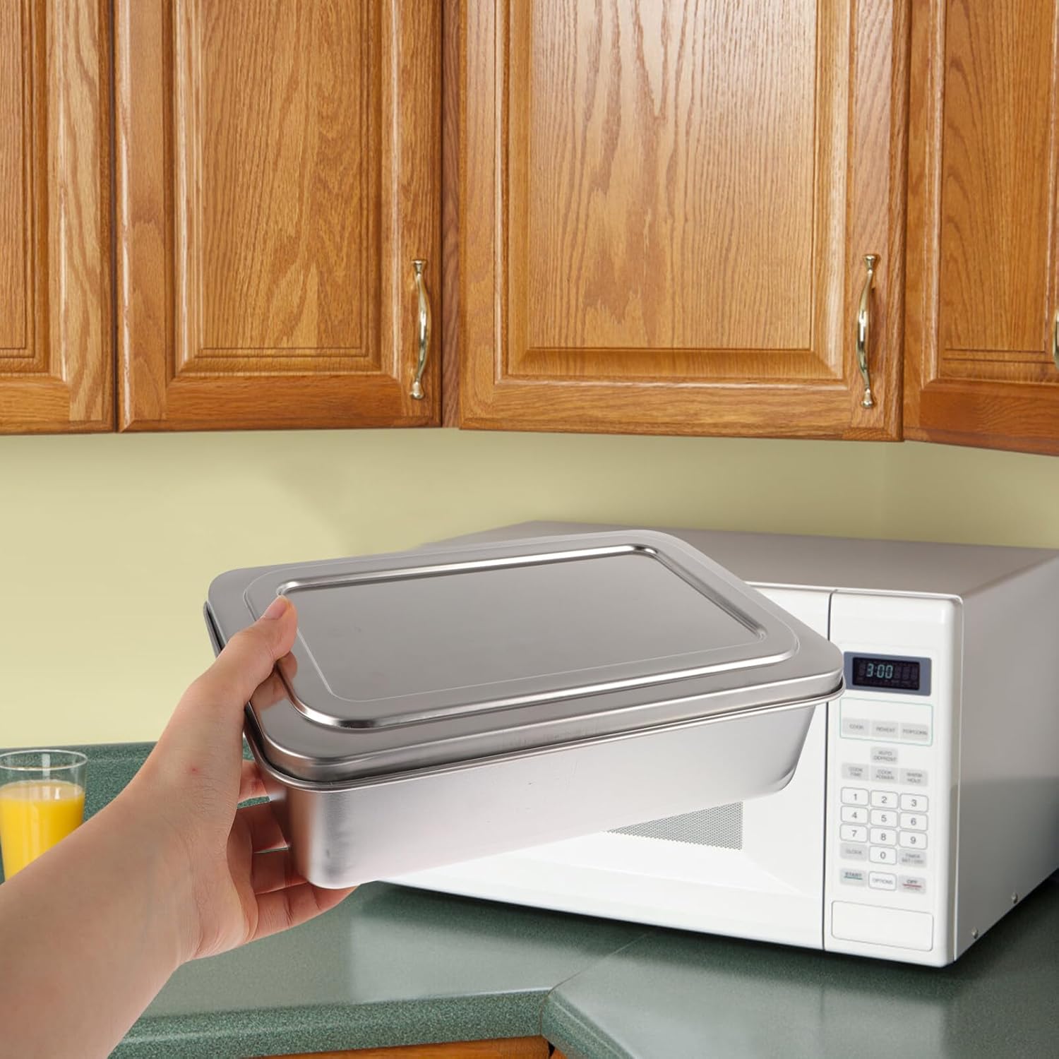 • Pancake Baking Tray Loaf Pan: This stainless steel baking loaf pan is a reliable device for baking bread, pancakes, cakes, toast, meatloaf, and more. You can trust its durability, as it is designed to withstand heavy use without the risk of breaking