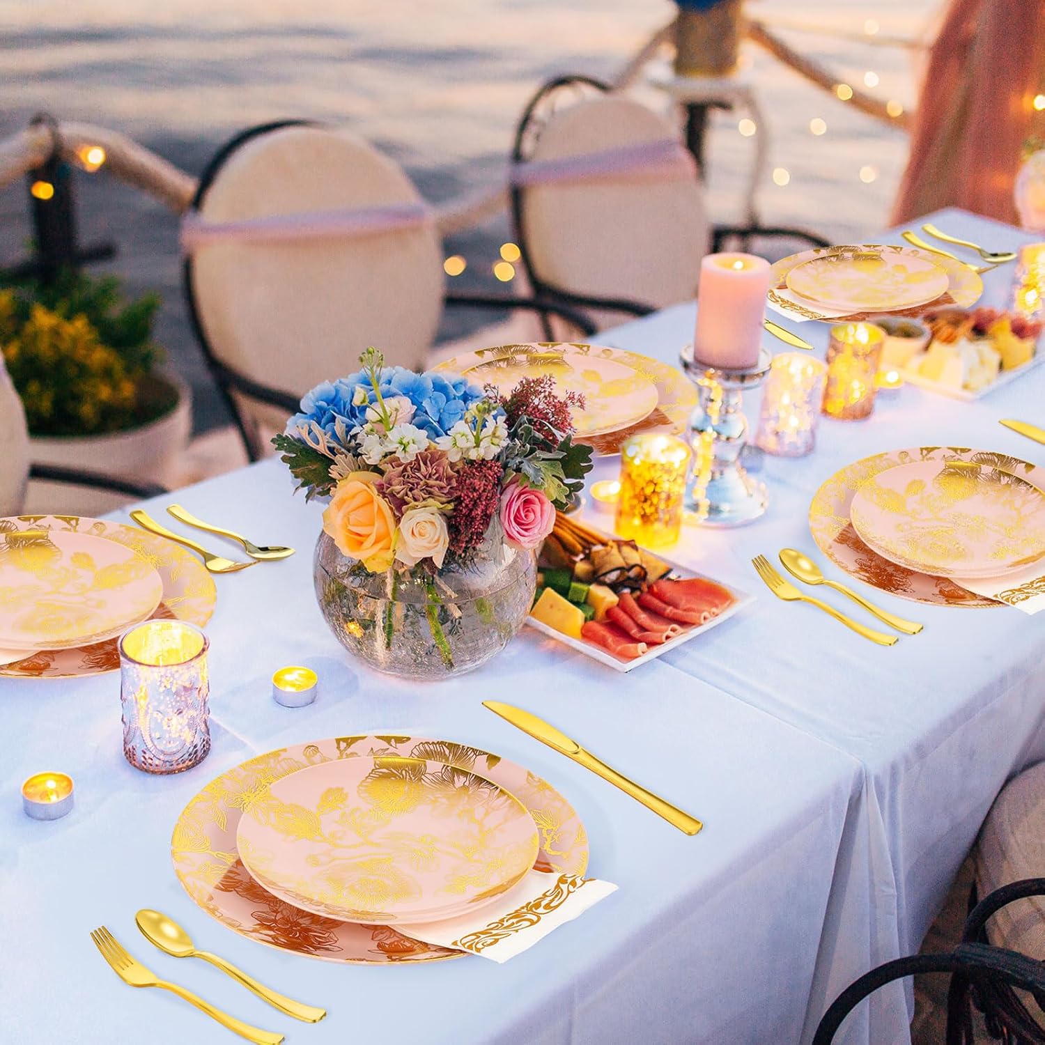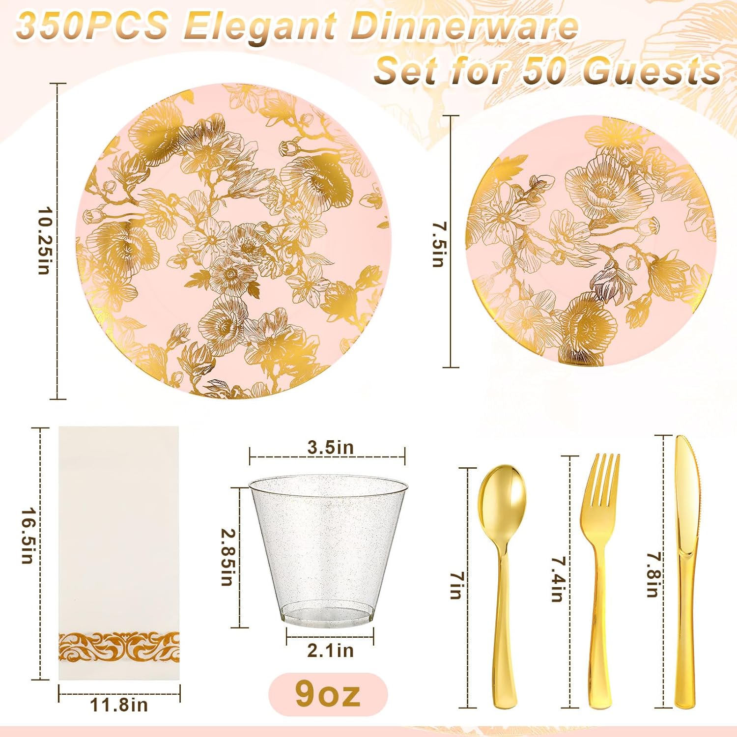 Tioncy 350 Pcs Gold Floral Plastic Dinnerware for 50 Guests Disposable Dinnerware Set Include Plates, Forks, Knives, Spoons, Cups, Napkins for Christmas Party Wedding Baby Shower(Pink Base Color)