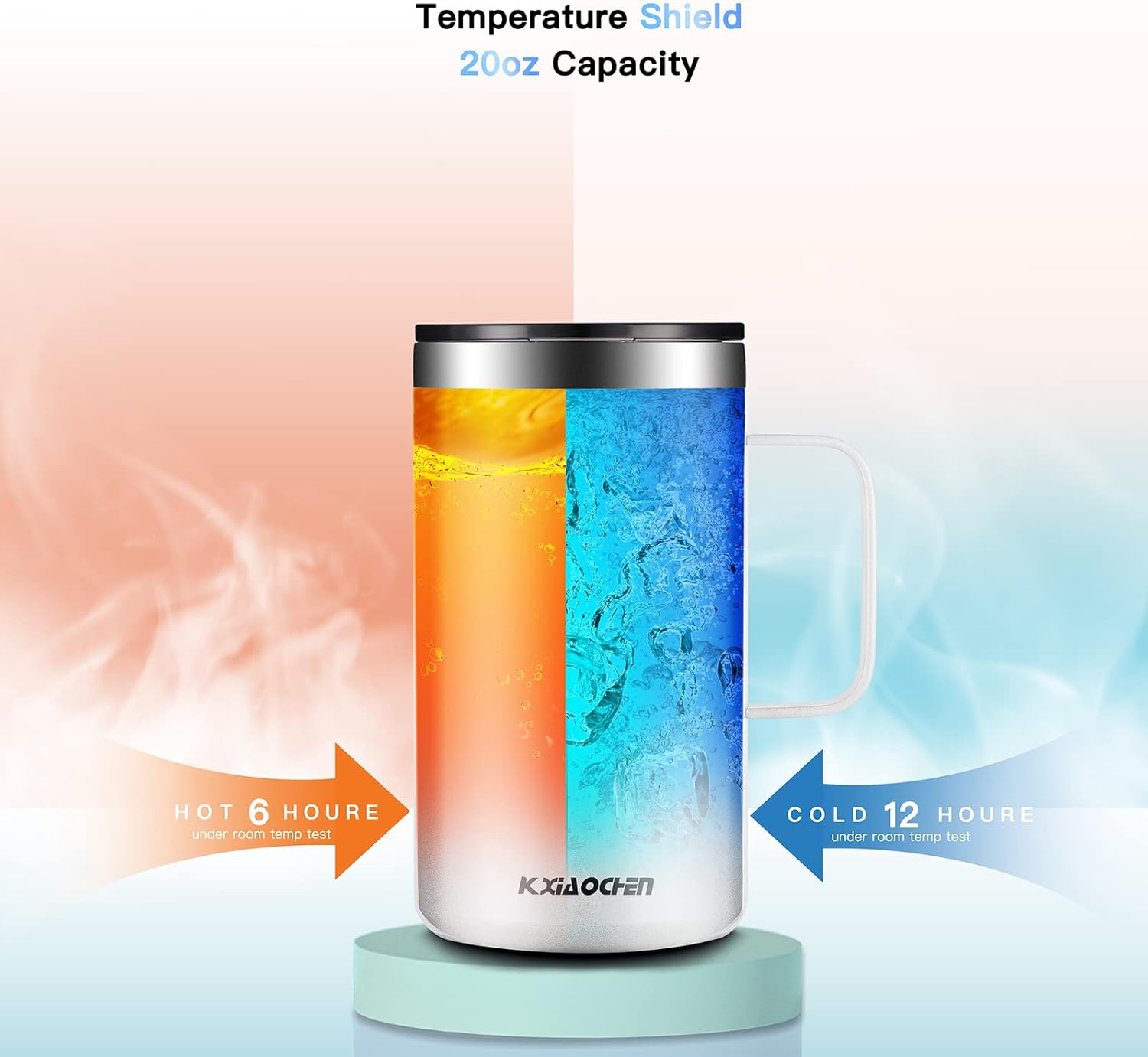 • INSULATED COFFEE MUG WITH HANDLE: 20oz coffee cup is large enough for heavy coffee lover at work, and also can be in beer gardens, home brews and the party. Insulated coffee mug with lid designed to keep your favorite hot, cold and carbonated beverages at the perfect temperature on the go.