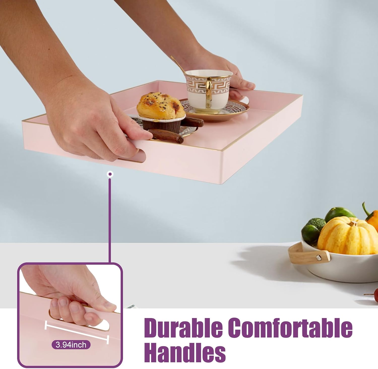 • 【Multipurpose Serving Trays】Designed for display and storage, this pink serving tray can be used as a decorative tray, makeup tray, jewelry tray, service tray and desktop organization tray.This serving tray can also be used as a storage box for small items such as keys or TV remote controls. Also perfect for serving snacks, breakfast lunch or dinner.