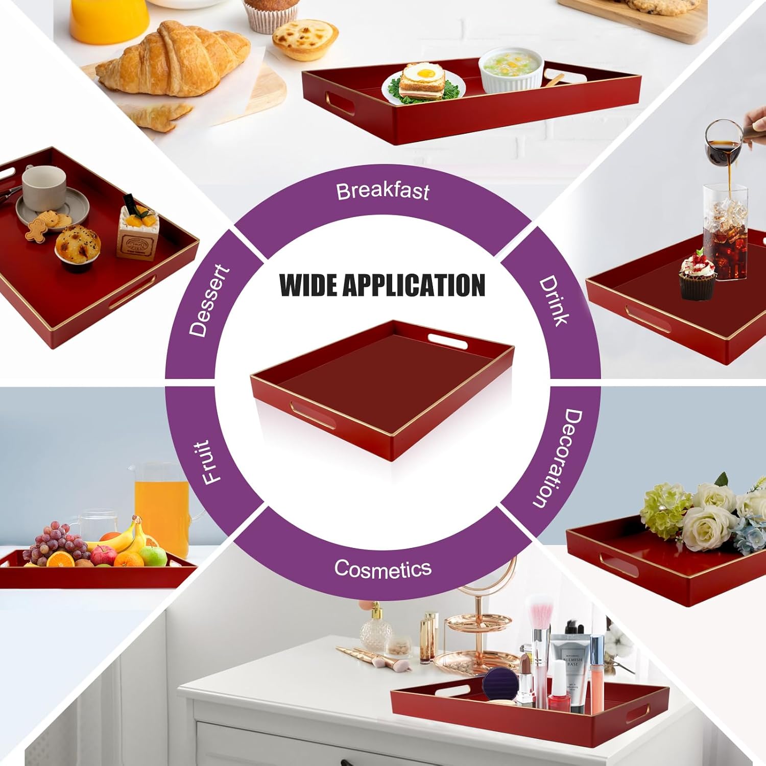 Gifturbo Red Large Serving Tray with Handles,Rectangular Plastic Elegant Decorative Coffee Table Tray for Ottoman, Living Room, Bathroom, Home Decor, Vanity Tray with Gold Trimming, 15.7” x 11.8”