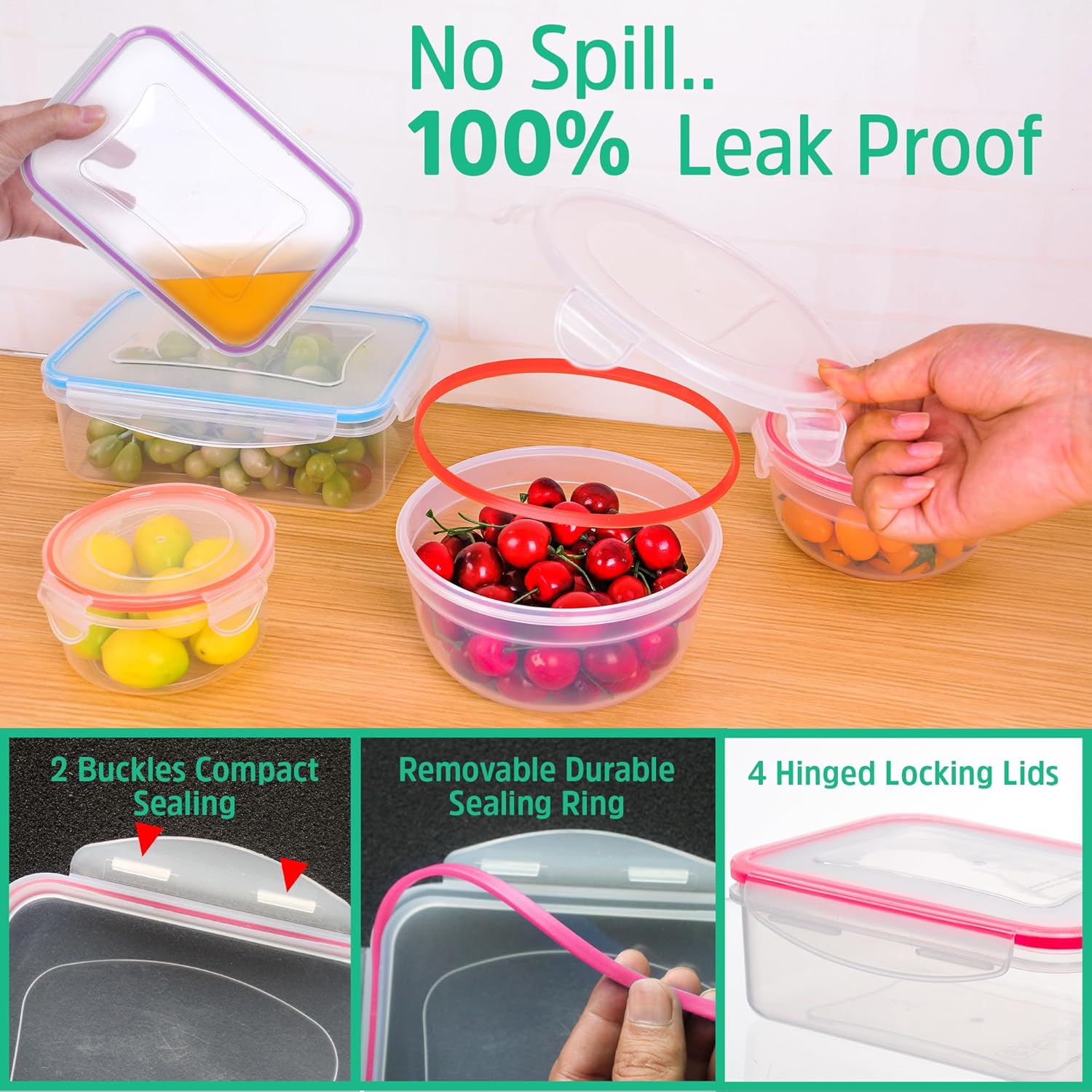 • LEAKPROOF AND OTHER BENEFITS: Our air tight food savers with 4 sides snap lock lids are microwave friendly (without lid), freezer and dishwasher safe, also good for carrying and storing as these are 100% percent leak proof . Now store everything without the fear of leakage
