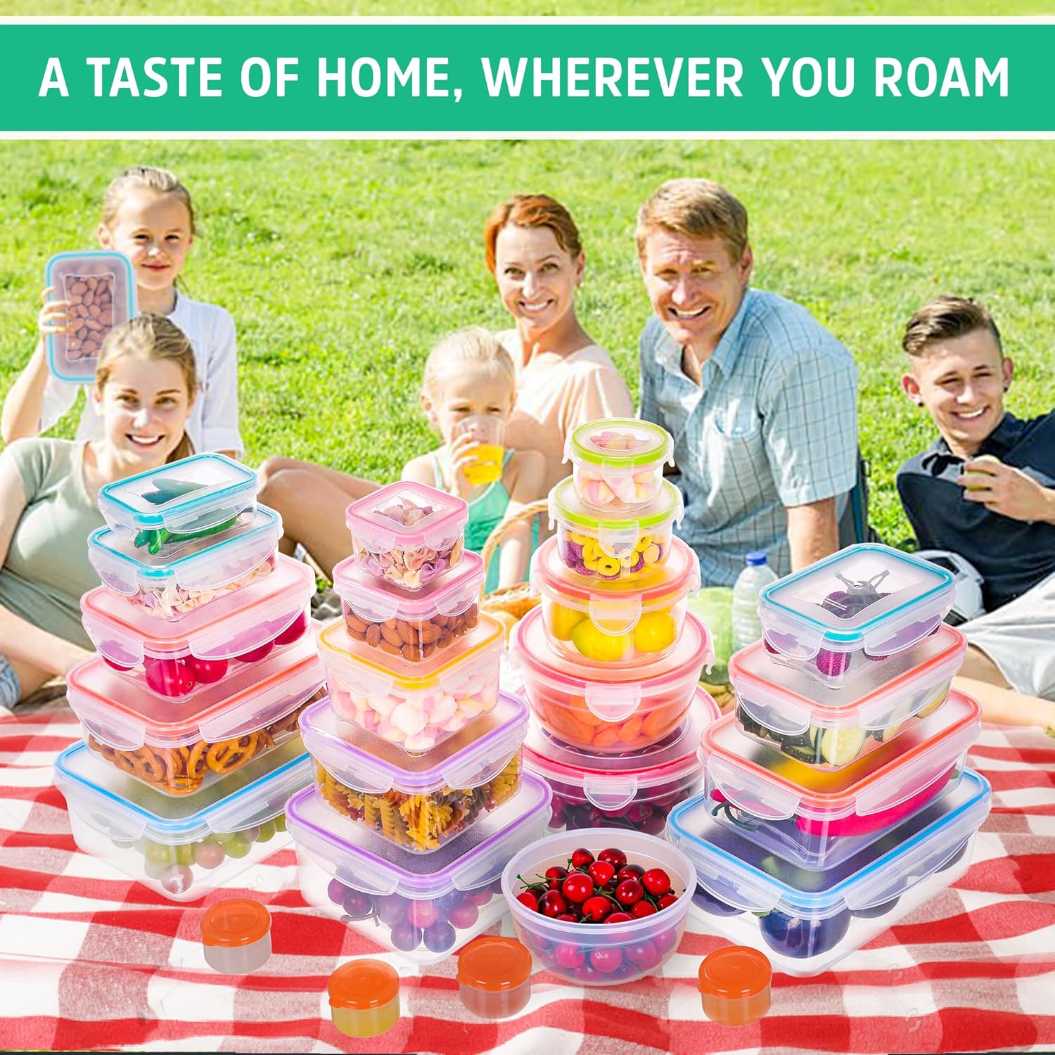 • VARIETY WITH MORE CAPACITY:23 containers with 23 lids of variable sizes a perfect fit for different variety of entrees. Suitable for occasions like carrying to picnic or events or daily uneaten food storage. This set includes 9* Rectangular Containers (2*50.7oz, 2*34 oz, 2*17 oz, 2*8.1oz, 1*4 oz), 9*Round Container (1*40.6oz, 1*23.7oz, 1*13.5oz, 1*6.1oz, 1*2.4 oz ,4 Suaces Boxes 1.35oz),5 Square Container (1*40.6oz, 1*23.7oz, 1*13.5oz, 1*6 oz, 1*2.4 oz)