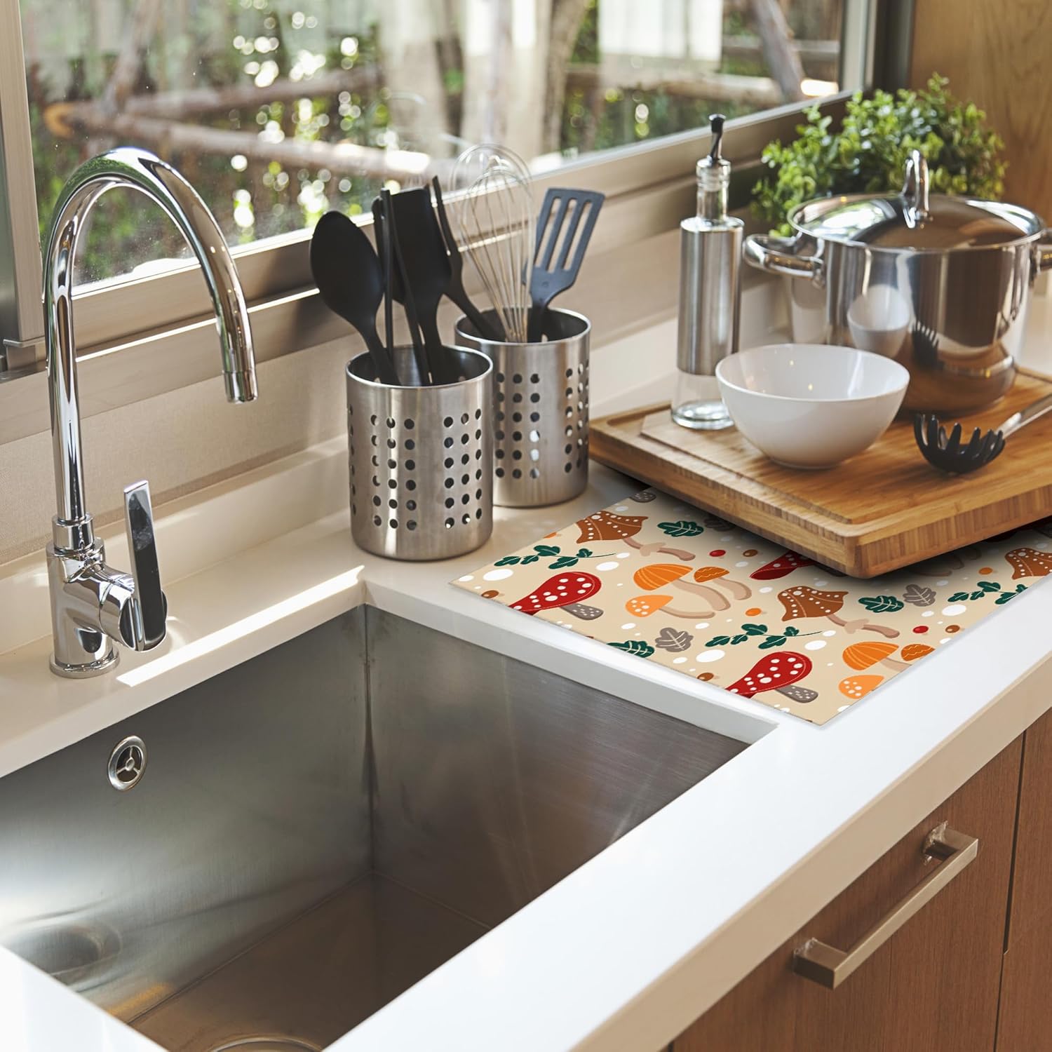 Funny Mushrooms Dish Drying Rack Mats Decor,Green Leaves Dish Pad Drying Mat Kitchen Counter 18x24 Inch Absorbent Reversible Microfiber for Coffee Bar Sink Countertop