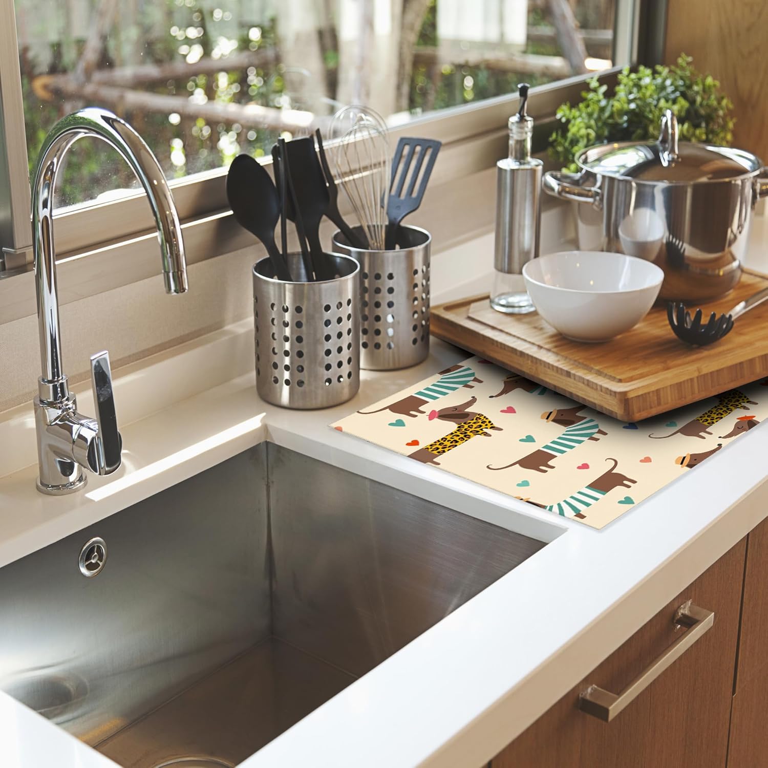 Dachshunds Dogs Dish Drying Mats 18x24 Inch,Leopard Print Hearts Dish Pad Drying Rack Mat for Kitchen Counter Ultra Absorbent Microfiber Dishware Coffee Maker Bar Countertop Decor