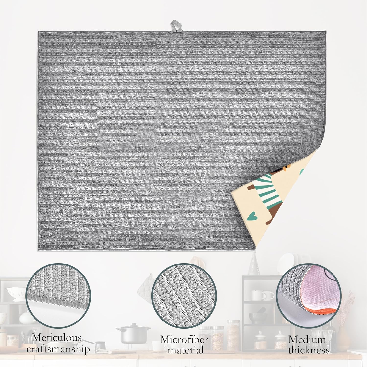 • DESIGN: Reversible with a different design on each side.The dish drying mat with hanging loop, can be hung on the kitchen wall. Soft and foldable, easy to store in any drawer, cabinet, or closet. Microfiber is naturally, long lasting, and cleans up easily, and is effortless to clean.