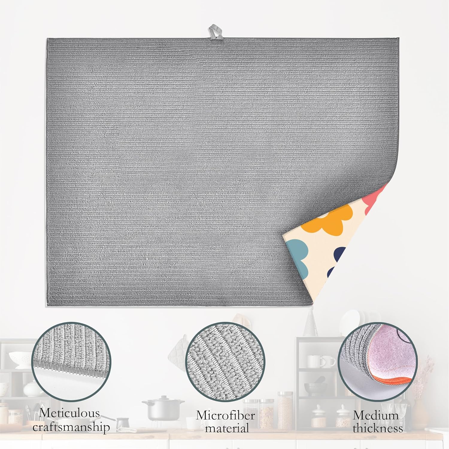 • DESIGN: Reversible with a different design on each side.The dish drying mat with hanging loop, can be hung on the kitchen wall. Soft and foldable, easy to store in any drawer, cabinet, or closet. Microfiber is naturally, long lasting, and cleans up easily, and is effortless to clean.