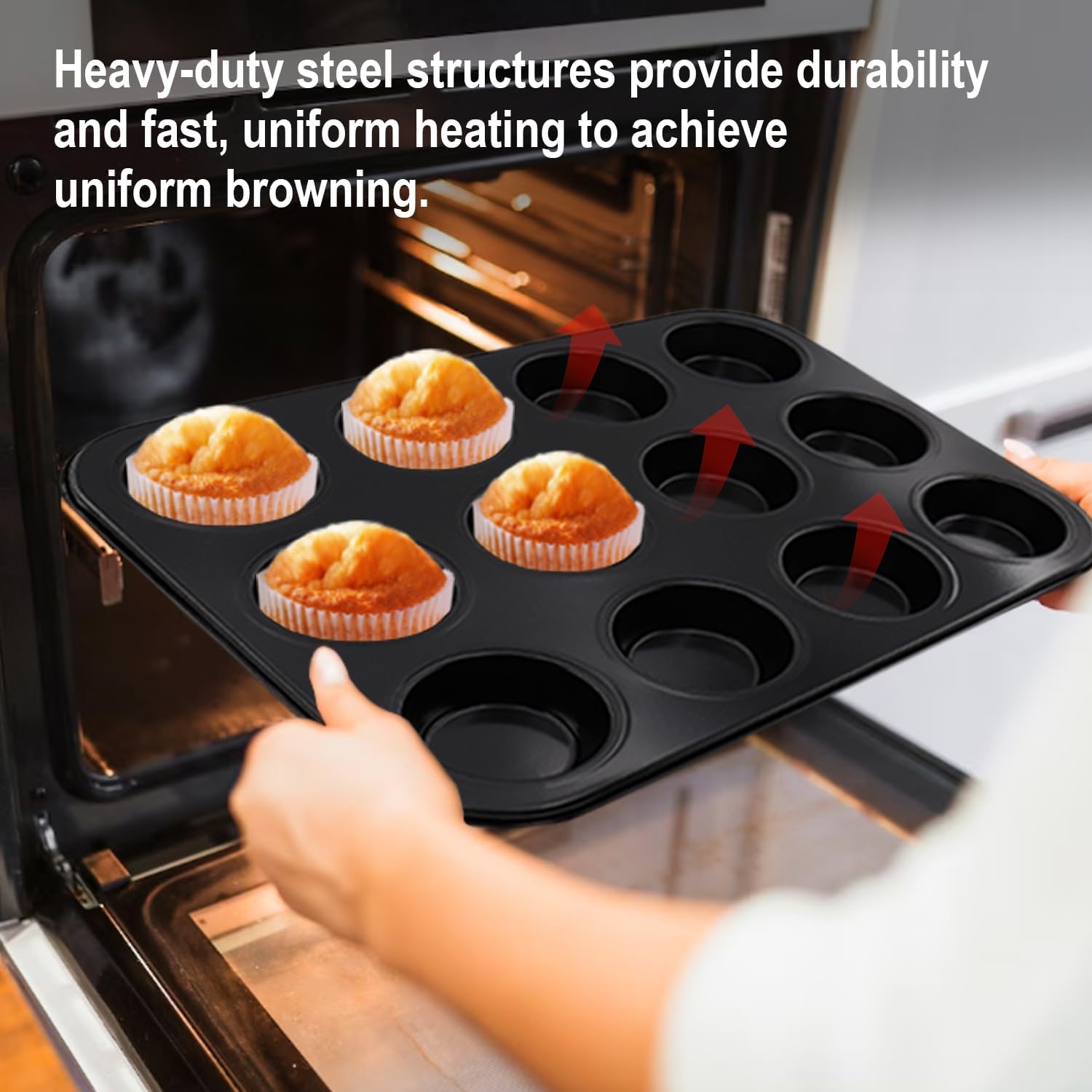 2 Packs Nonstick Round Muffin Baking Pan, Premium Steel Muffin Pan for Baking, Nonstick Cupcake Tin Cheesecake Pans, Bakeware Muffin Top Pan (12 Cups, Black)