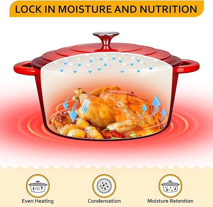 • 【INTERNAL CIRCULATION DESIGN】 This enameled dutch oven pot is design with circulating shower type lid, the raised design of the pot cover allows the water vapor circulates and locks inside the dutch oven, fully releasing the flavor and nutrients of the ingredients, possess pretty heat retention performance.