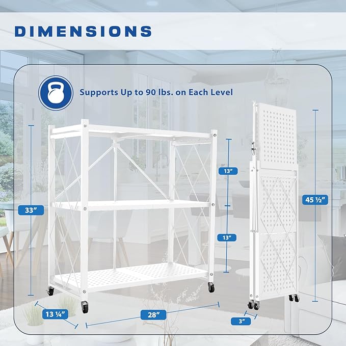 • ✅【 Measurements 】Storage Form: 33" Tall x 28" Wide x 13.25" Deep --- Compact Form: 45.5" Tall x 3" Wide x 13.25". Able to hold up to 90 lbs on each level. This foldable shelf comes pre-assembled and ready to go!