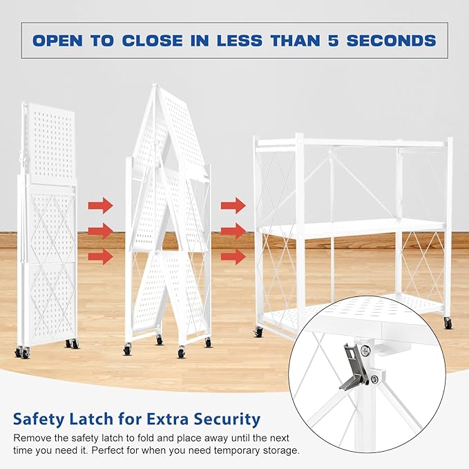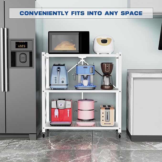 Lifetime Home 3-Tier Foldable Storage Shelf with Wheels - Metal Rack Collapsible Shelving Unit Display, Rolling Cart for Books Kitchen Storage Shelves, Pantry & Closet Organizer, Office Room Decor