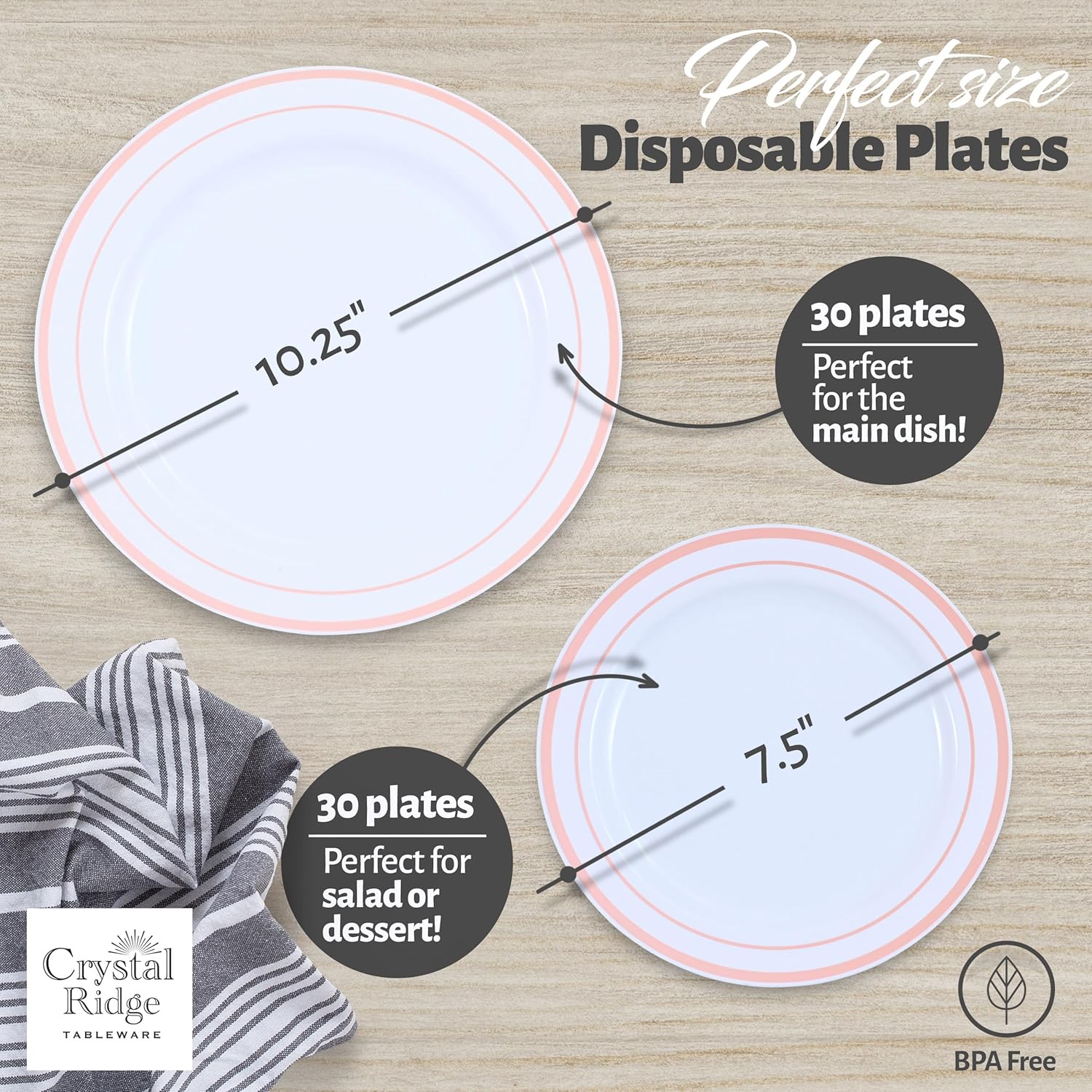 60 Pieces White Plastic Disposable Plates - Premium Heavy-Duty 30 Dinner Plates & 30 Salad Plates with Pink Rim Ideal for Party, Birthday and Special Events