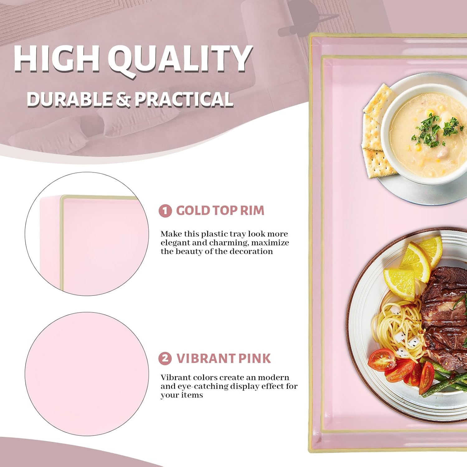 • HOME DECOR: These serving trays for ottoman feature a solid pink finish and gold rim top, which can add a touch of elegance to your living space. The smooth surface makes these vanity trays very easy to clean, just wipe gently with a damp cloth or paper towel and then dry it immediately.