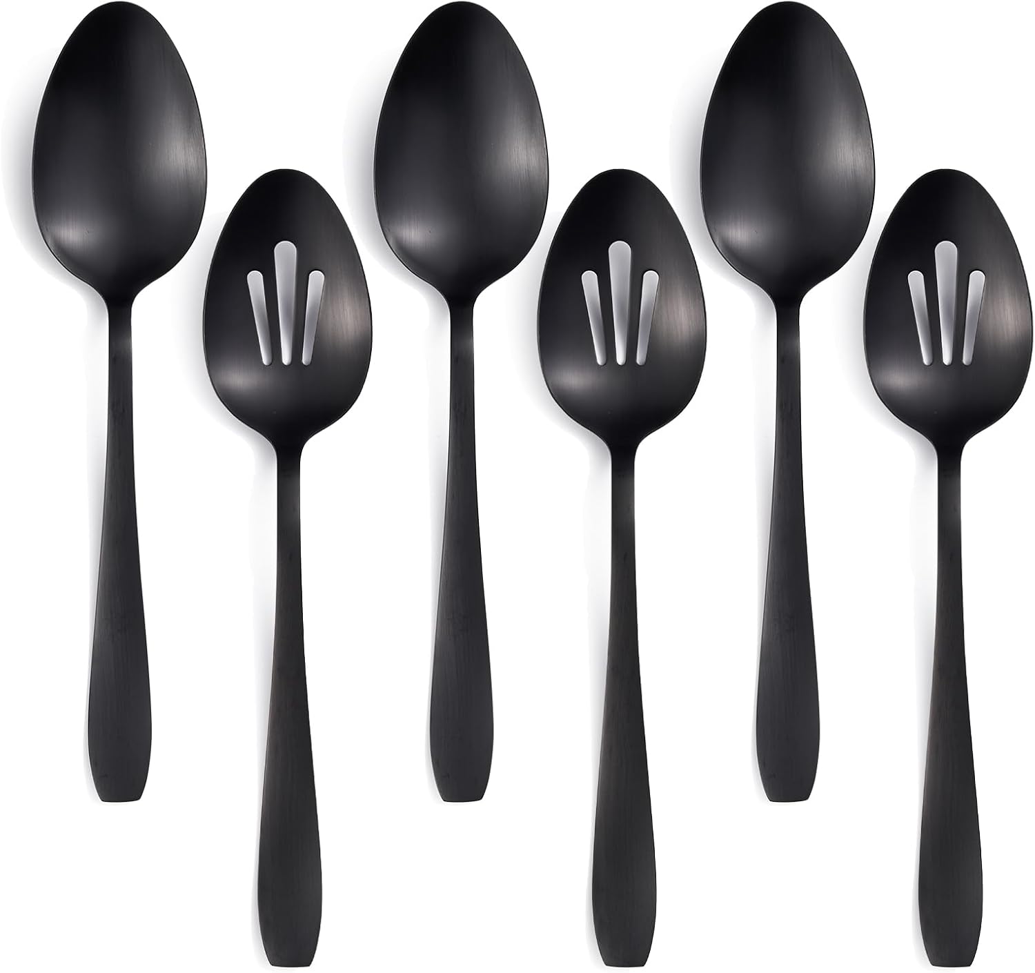 6 Pieces Large Serving Set - 3 Spoons & 3 Slotted Spoons - 10.6 Inch Matte Black Stainless Steel Utensils - Dishwasher Safe for Kitchen, Buffet, Party, Restaurant