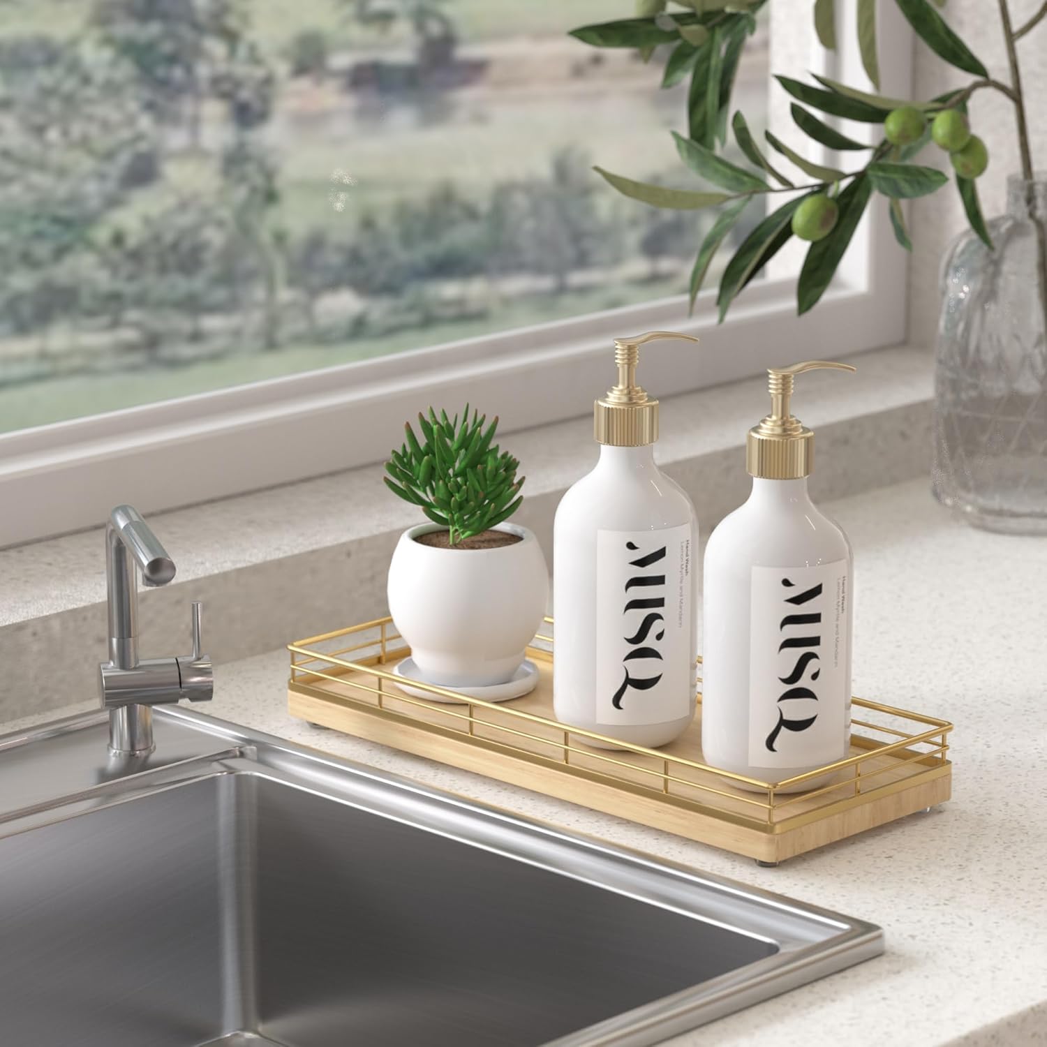 • Versatile Functionality: Elevate your daily routine with our bathroom counter tray; Neatly arrange bathroom essentials like soap, toothbrushes, cotton swab and lotions, keeping your countertop tidy; Add a touch of elegance to your dresser by using the vanity tray to showcase perfumes, jewelry, and cosmetics; Impress your guests with neatly arranged hand towels and toiletries presented on the small tray or use it as a toilet tank tray