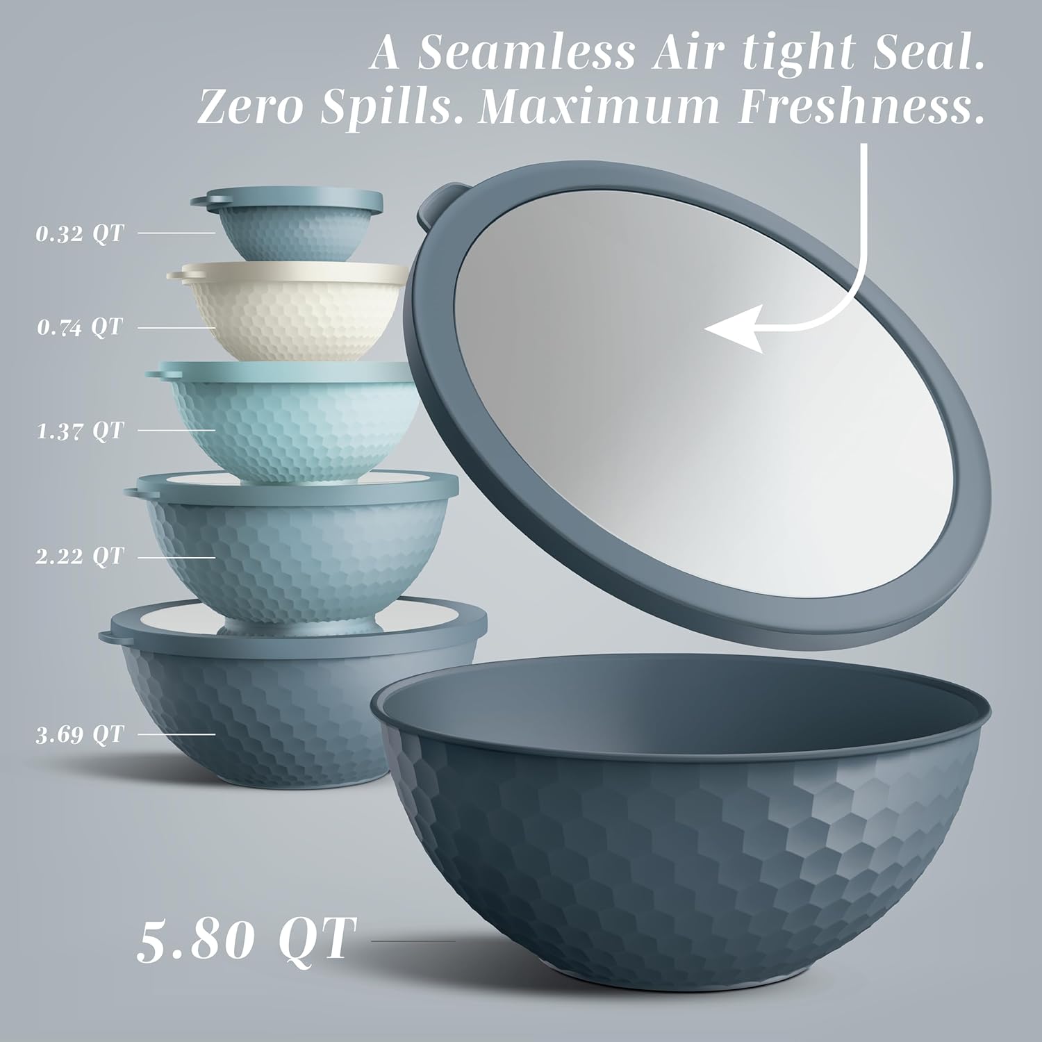 • Set includes 6 plastic bowls and 6 TPR lids; Bowl capacity of 0.32 QT, 0.74 QT, 1.37 QT, 3.69 QT and 5.8 QT.