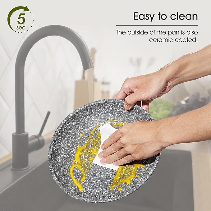 • Scratch Resistant: The German GREBLON ceramic coating is more scratch resistant than traditional non-stick coatings, so you can use metal utensils without worrying about damaging the surface. Ceramic coating is also used on the outside of the pot and pan