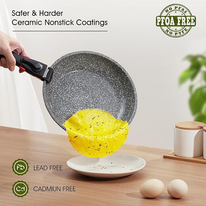 • Versatile Cooking Options: This set includes 9.45'' and 11'' fry pan, 6.3'' (1.7QT) and 7.87'' (3.2QT) saucepan, 2 glass lids, 1 detachable handles