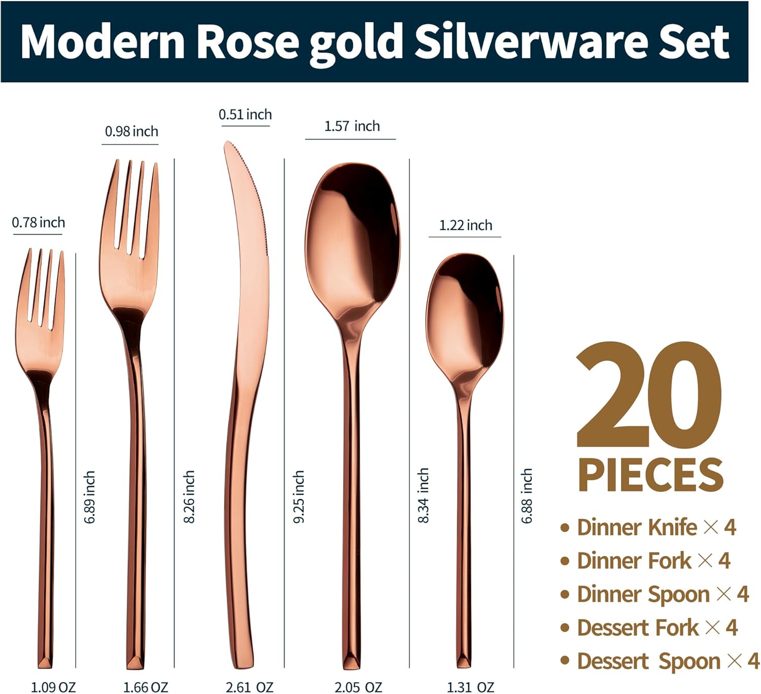 Lemeya 20-Piece Rose Gold Silverware Set for 4,Modern 18/10 Stainless Steel Flatware Set,Luxury Cutlery Set,Unique Utensils Set for Restaurant,Spoons and Forks Set,Mirror Polished,Dishwasher Safe