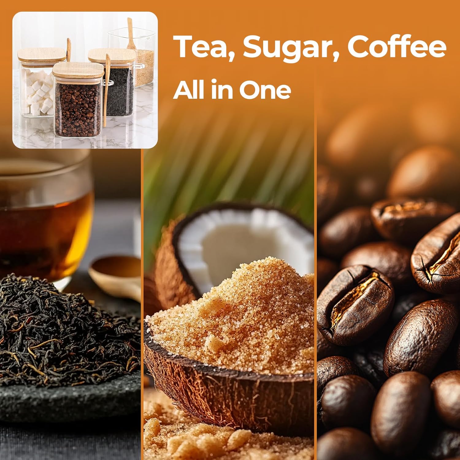 • Convenient and Versatile: The transparent glass of our square glass jar provides a clear view of the contents, making it perfect for storing various food like, pasta, oats, flour or tea, especially for coffee beans and sugar near your coffee machine; It will be a great addition to cocoa, hot chocolate, coffee bar; With the included spoon, it's easy to scoop and use your stored items efficiently, even for bath salt or tea storage