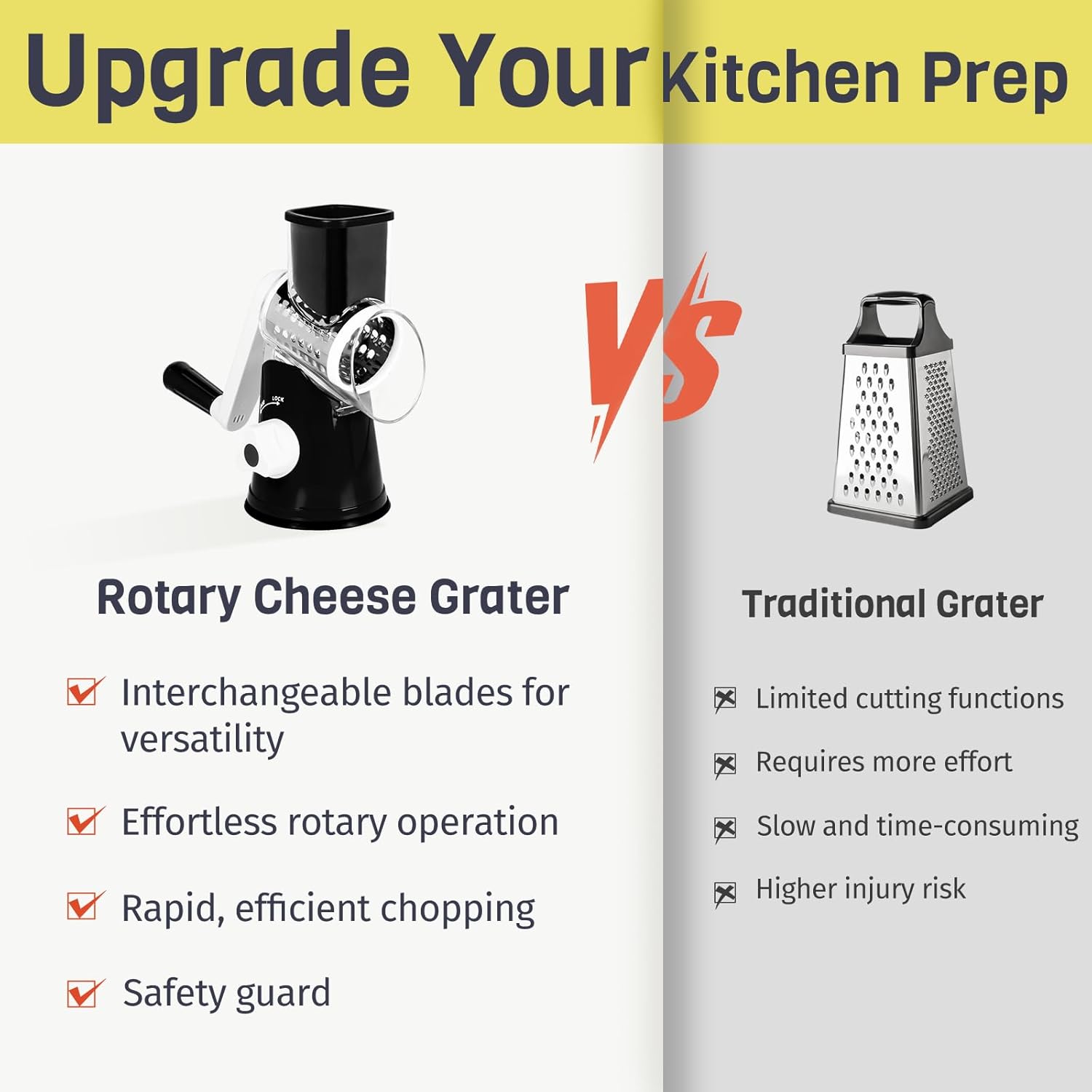 • Time-Saving Convenience: No more manual chopping and slicing. Our cheese shredder delivers uniform cuts in seconds—grate a pound of cheese in just 30 seconds. Enjoy more time savoring your creations and less time preparing. The attached food pusher keeps your hands safe from the blades, making cooking stress-free