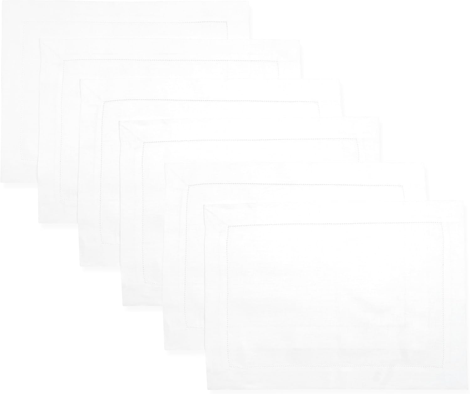 D'Moksha Homes White Linen Placemats Set of 6 - Classic Hemstitch Placemats 14 x 19 Inch - 100% Pure Linen Table Mats for Fall, Autumn and Halloween - Handcrafted and Machine Washable