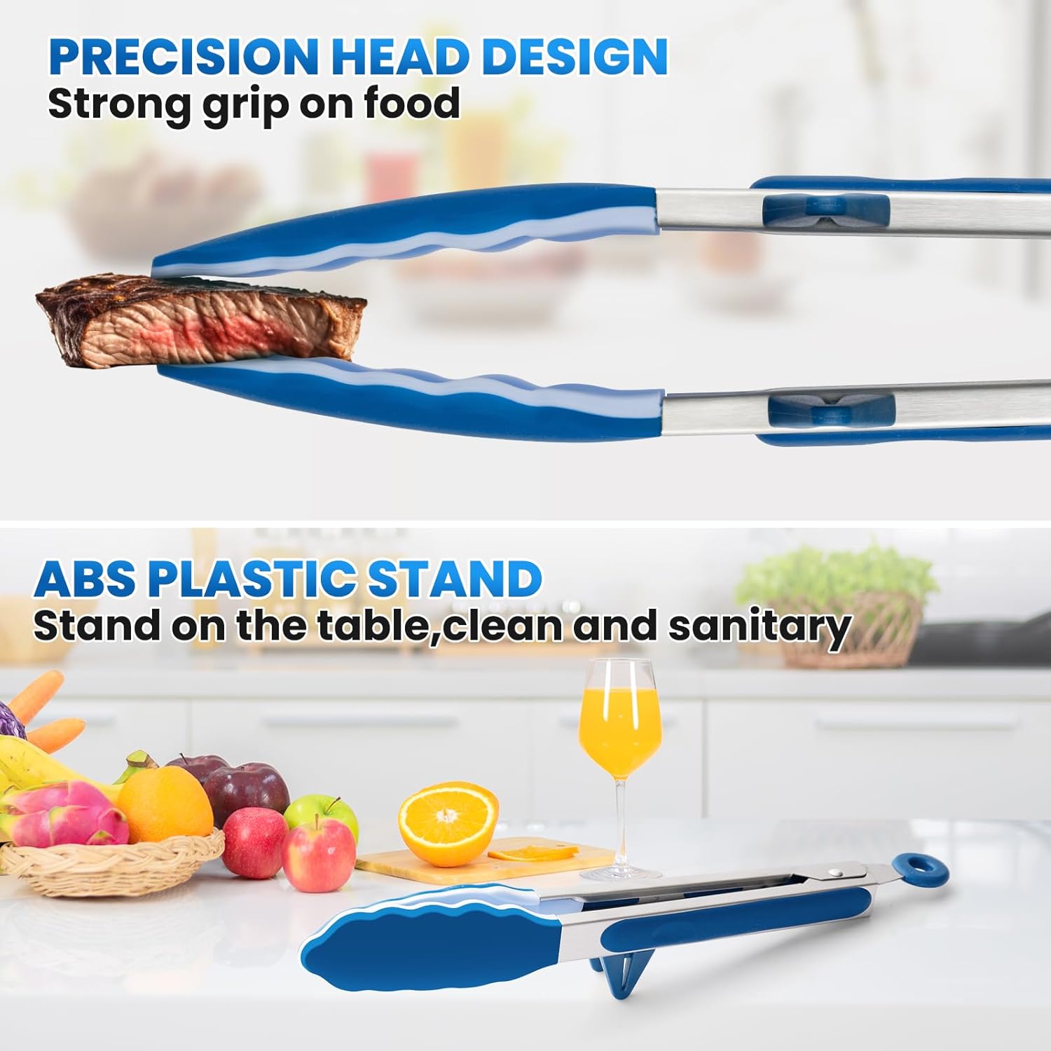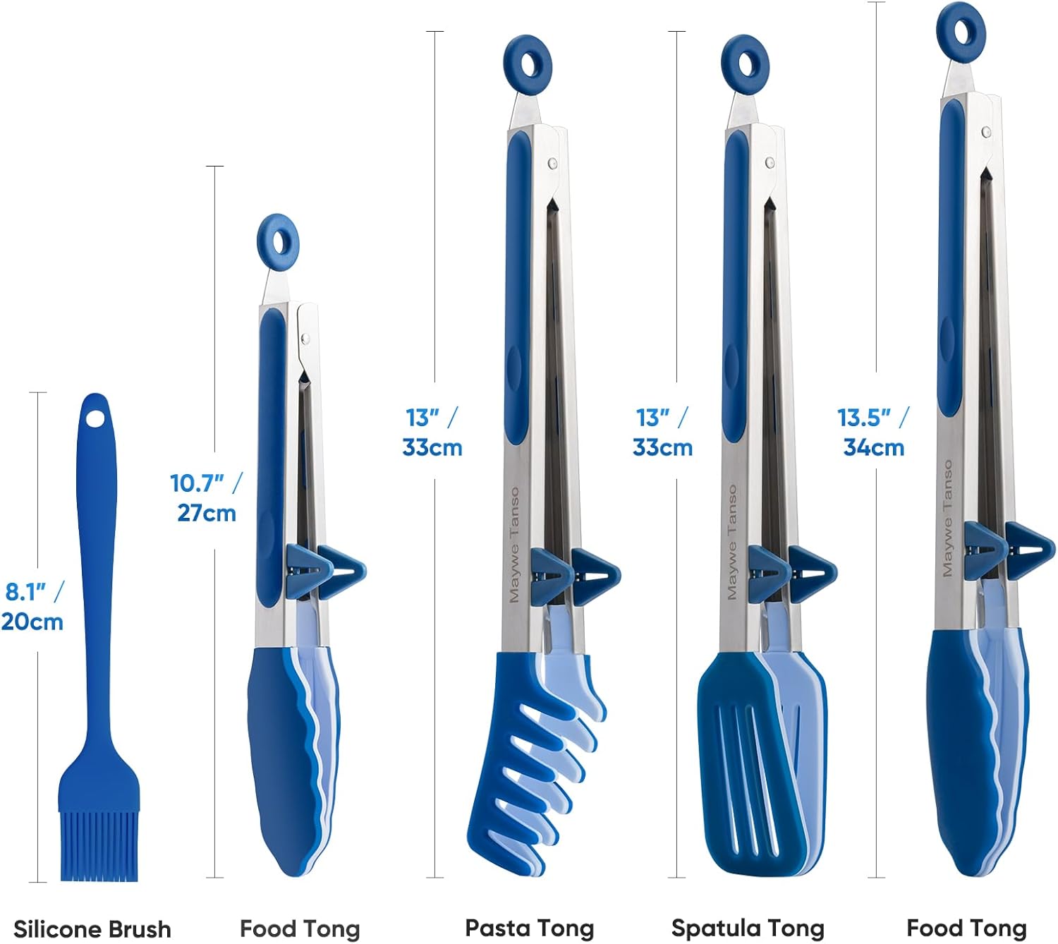 • SILICONE KITCHEN SET: Our blue tongs set includes 1pc 13.5" Food Tong,1pc 13" Spatula Tong,1pc 13" Pasta Tong,1pc 10.7" Food Tong and 1pc 8.1" Silicone Brush.Designed in double-color silicone tips and stainless steel tones,this silicon tongs kitchen utensils set has an super fashionable look,practical function that is madly in line with the current styles and daily needs.Comes in a exquisite box,it is sure to delight your friends and family!