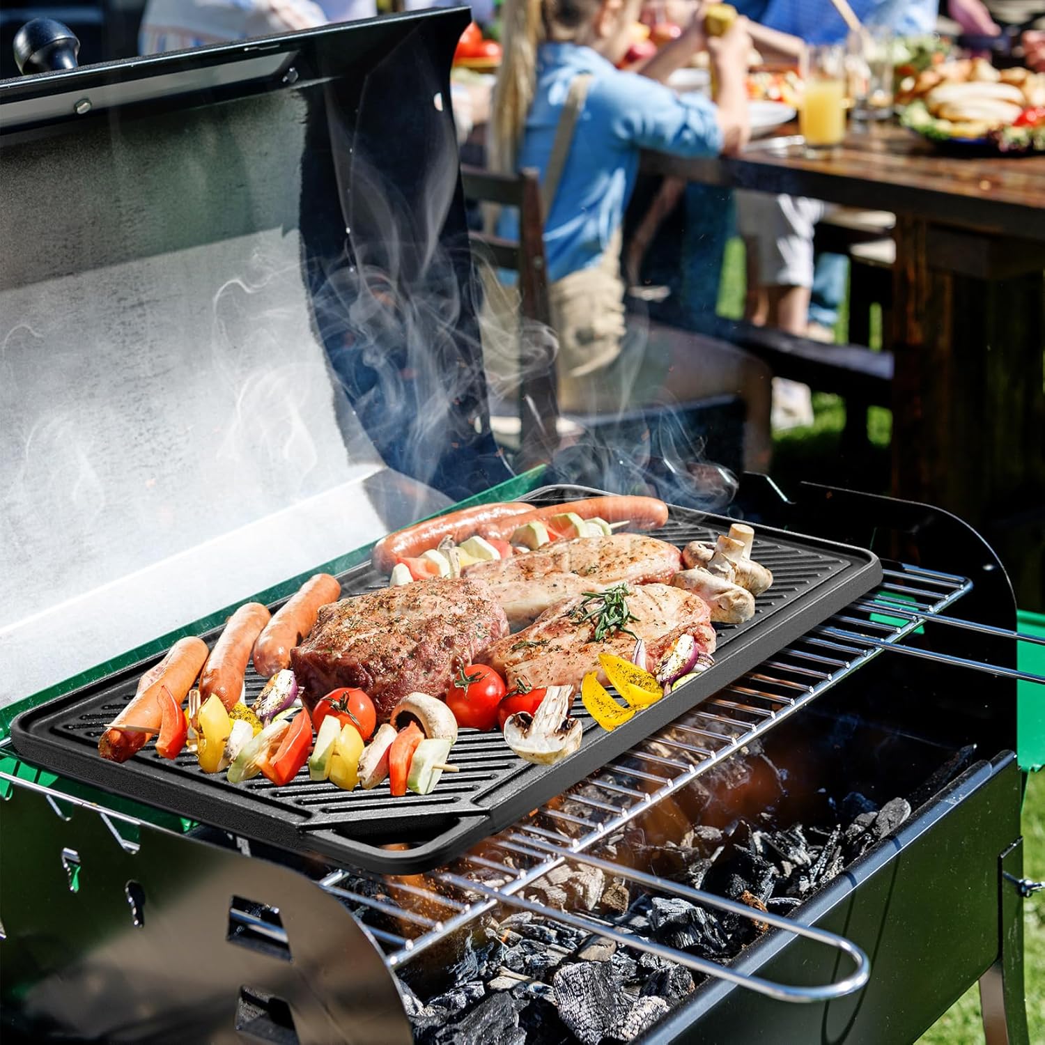 • Reversible Design: One baking pan, both sides can be cooked, the ribbed side is used for grilled foods, such as steaks, lamb chops, fish and chicken; the flat side is used for pan cakes, toast bread, hamburgers, tortillas, fajitas, eggs, bacon, hot dogs, luncheon meat, minced meat, scallops, shrimps, veggies. Versatile and multipurpose grill pan perfect for indoor or outdoor BBQ, you can prepare food for family and friends wherever you go, enjoy different styles of delicious and frying fun