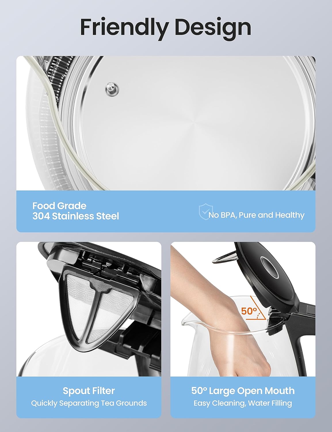 • Easy to Fill & Clean: The wide mouth and non-removable 50° lid make filling and cleaning the glass kettle a breeze. The teapot electric kettle has convenient measurement scale marks to help you boil the perfect amount of water. Hand wash regularly with baking soda or lemon to keep your clear tea kettle clean.