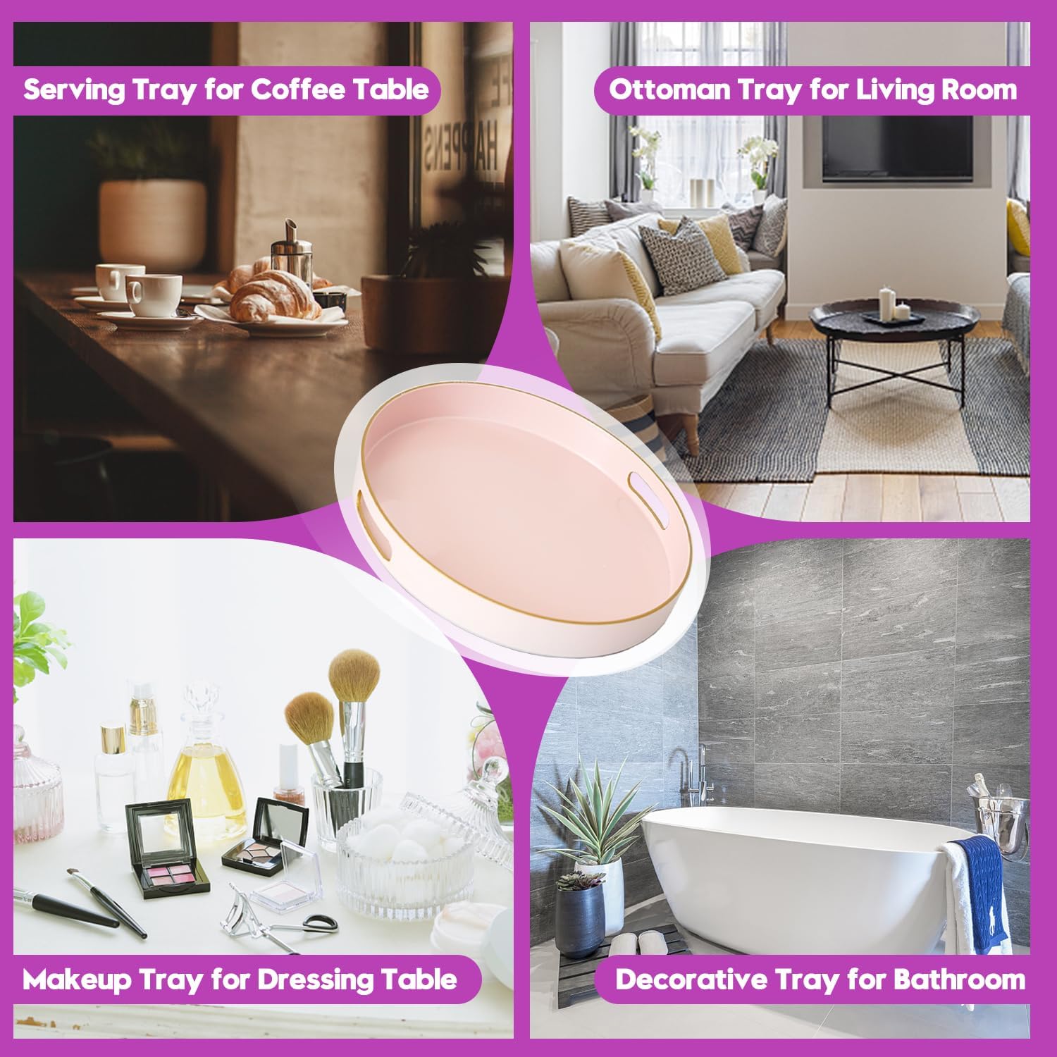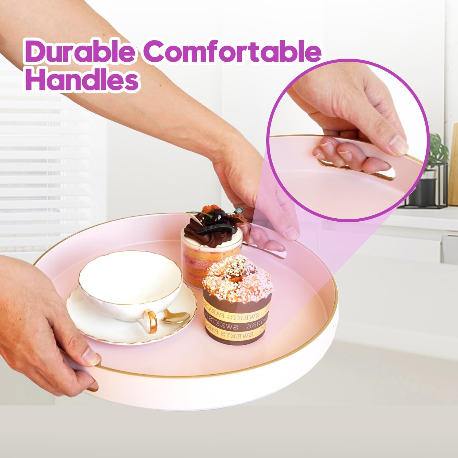 Gifturbo Matte Pink Decorative Serving Tray,Round Serving Trays with Handles, Coffee Table Tray Ottoman Round Plastic Trays for Living Room, Bathroom