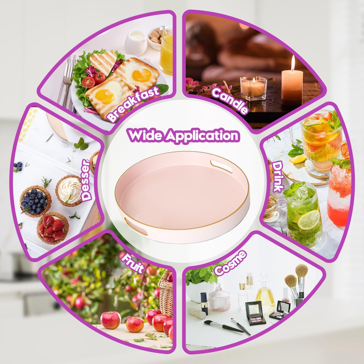• 【Multipurpose Serving Trays】Designed for display and storage, this pink round plastic serving tray can be used as a decorative tray, makeup tray, jewelry tray, service tray and desktop organization tray.This serving tray can also be used as a storage box for small items such as keys or TV remote controls. Also perfect for serving snacks, breakfast lunch or dinner