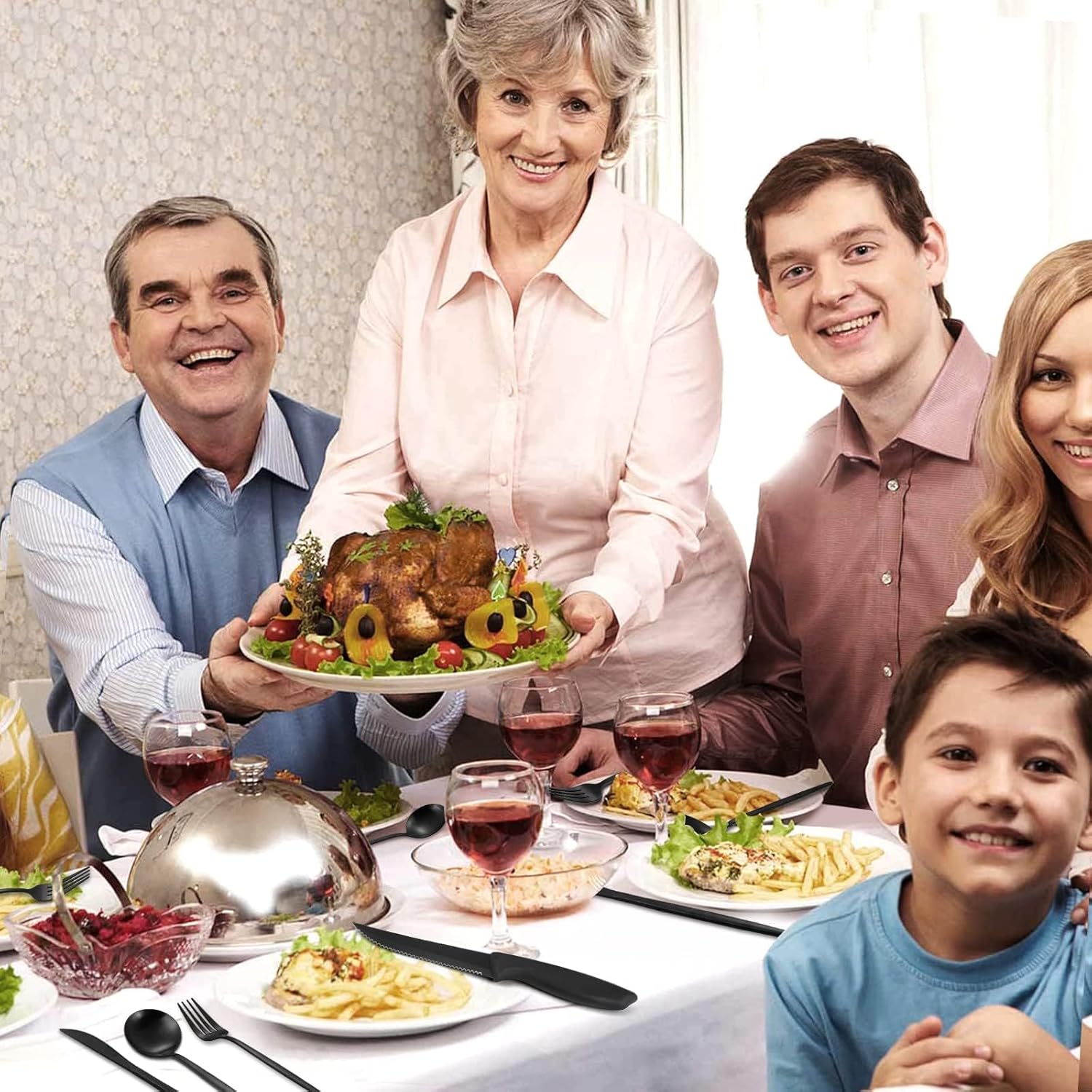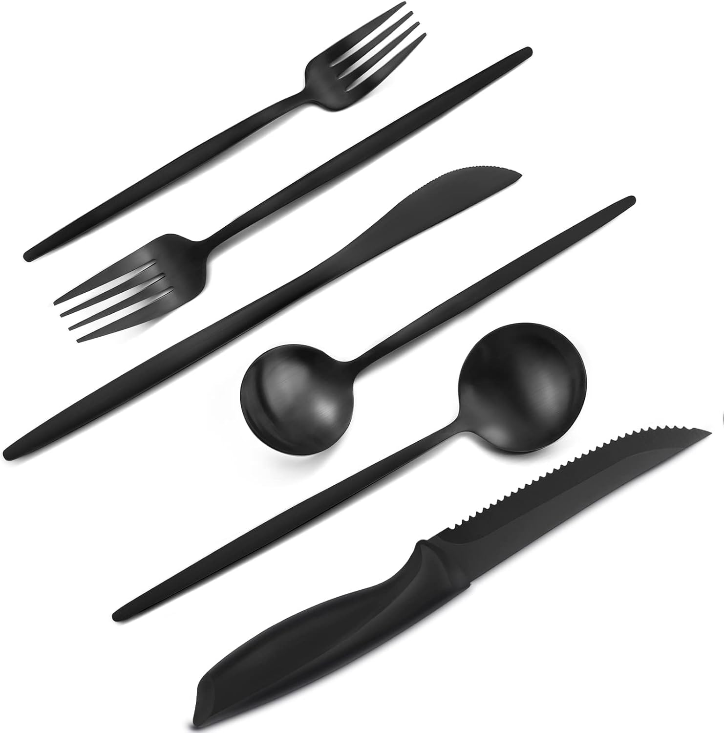 • Add steak knife - VANVRO 48 pieces matte black silverware set with steak knife,stainless steel black utensil set constantly enrich the product line, This time,black cutlery set with steak knife was added, which has more comprehensive functions. What a happy thing it is for the whole family to enjoy steak dinner together.