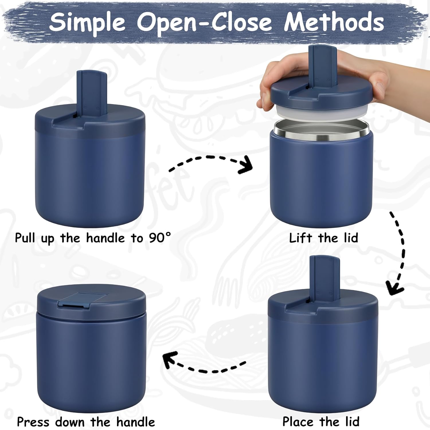 • Buckle Structure Lid:Our food container with a press-seal structure, Just pull up the handle to 90 ° to open the lid, which is very friendly to children, so children's little hands can easily open it.
