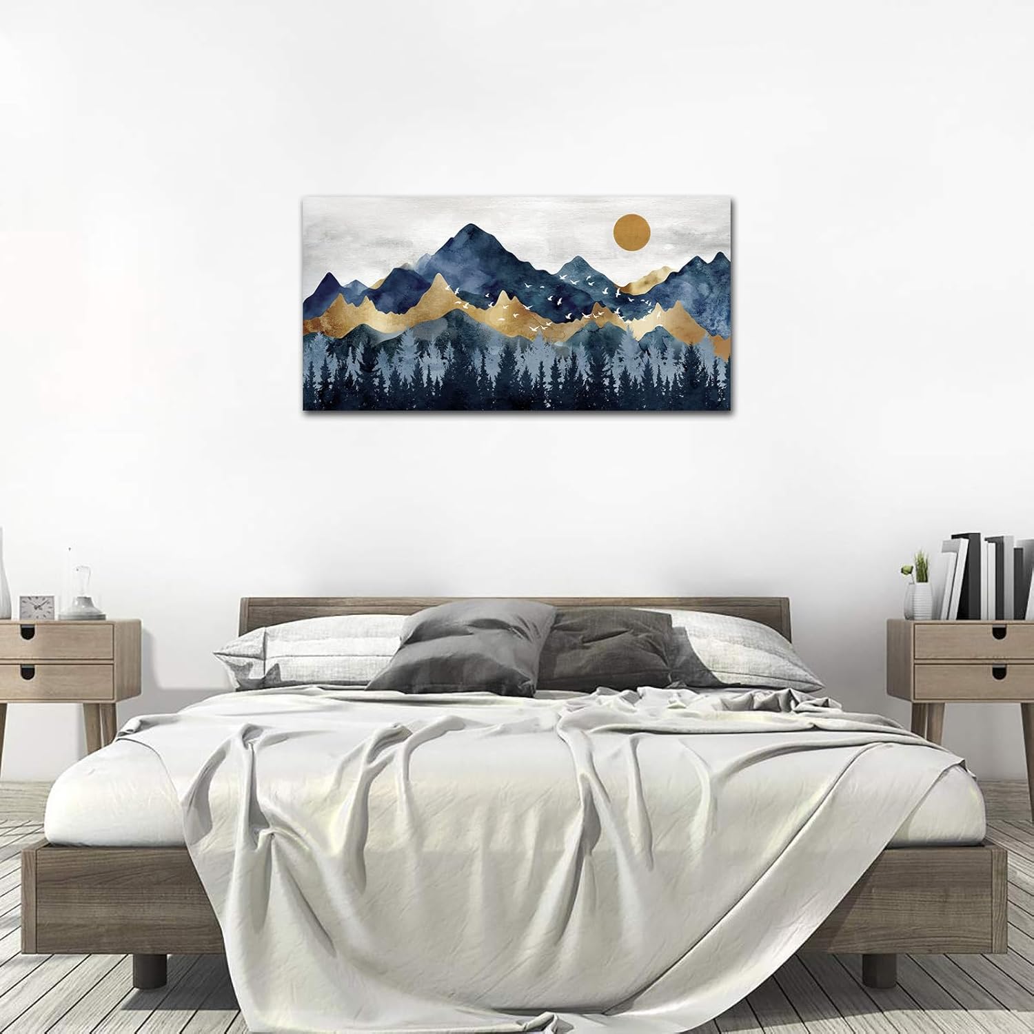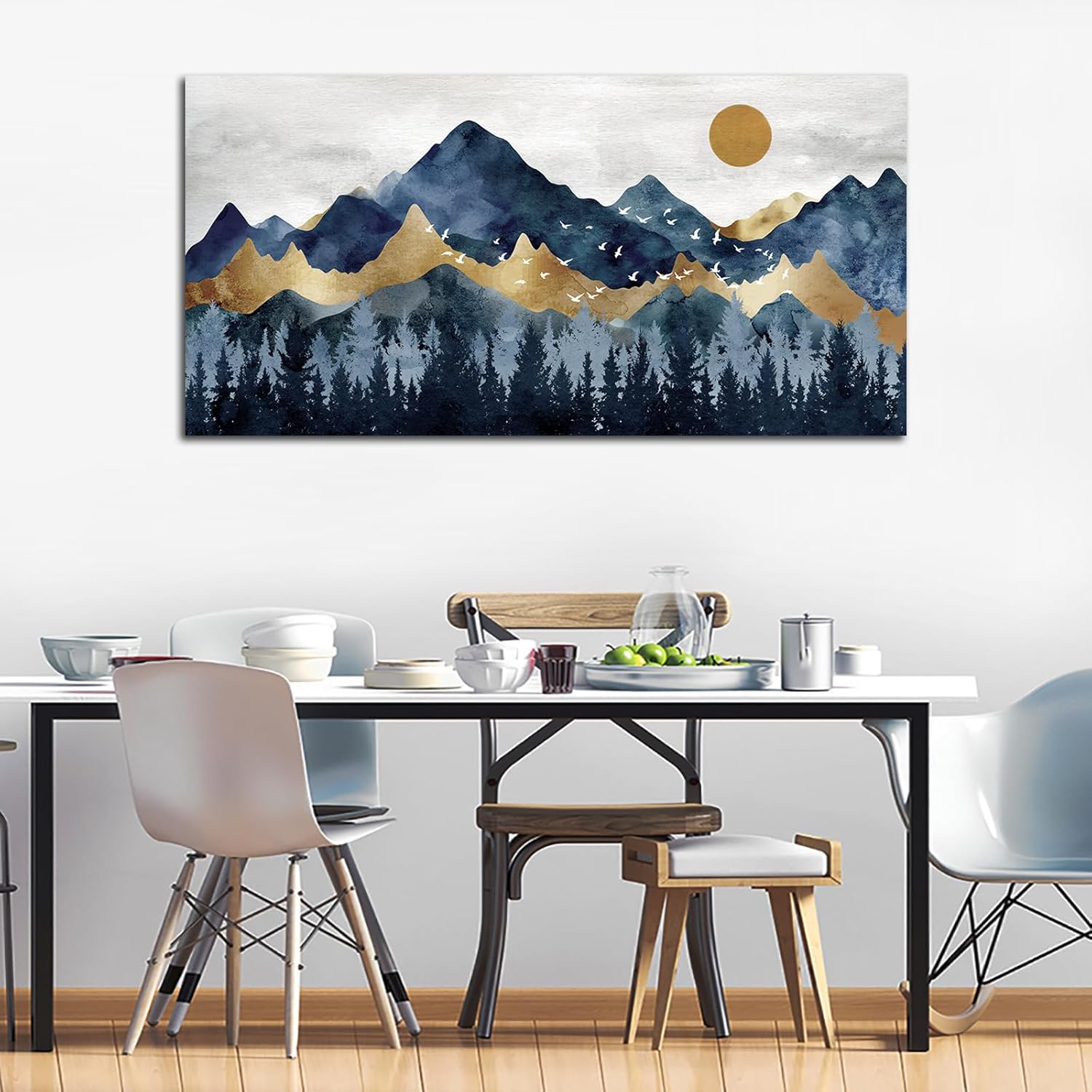 Abstract Nordic Canvas Wall Art - Indigo Blue and Brown Mountain Forest Picture Wall Decor Sun Birds Canvas Painting Nature Landscape Prints Artwork for Living Room Bedroom Decoration 29" x 58"