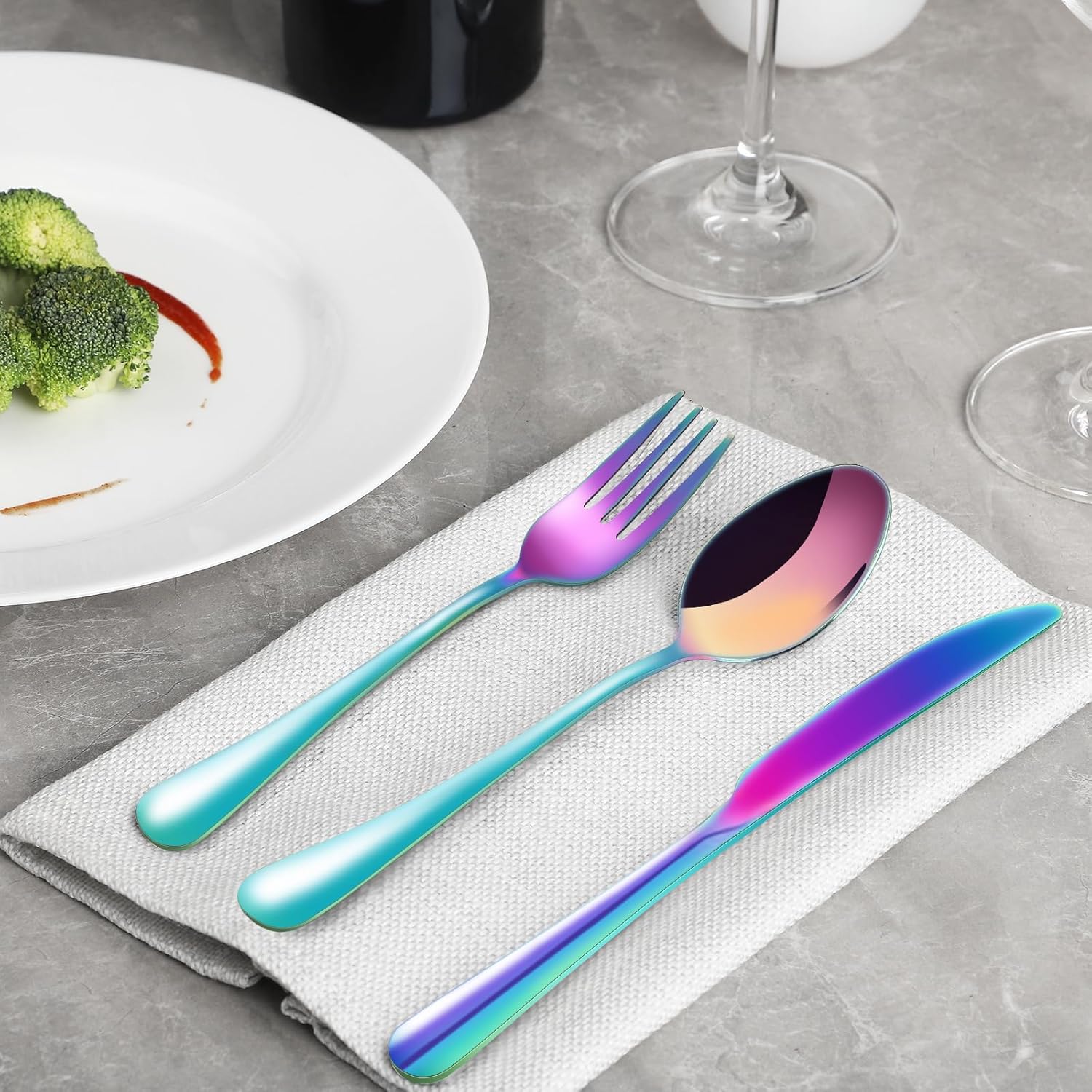 • ✅[The Best Partner for Dinner Table]---This shiny rainbow flatware set service for 6 is perfect for Christmas party, Thanksgiving Day, Housewarming, Wedding, Restaurant, Hotel. Its also ideal for family daily use, parties, gatherings, family dinners, candlelight dinner, banquet or other formal occasions. Simple classic modern design would match well with your existing cutlery and elevate everyday meals into a fine dining experience