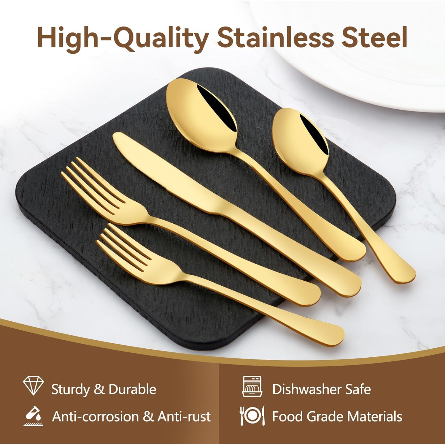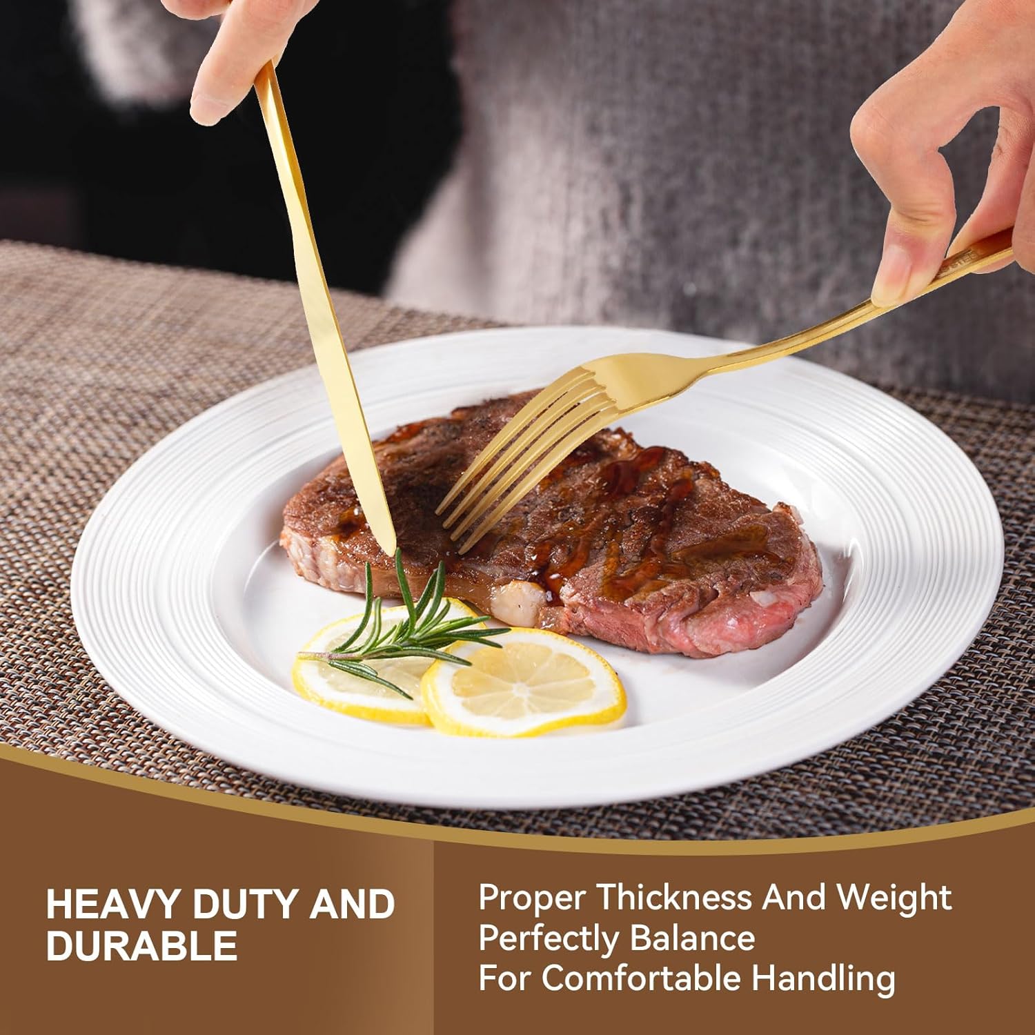 • [Luxurious Shining Gold Design]---The golden titanium plated appearance shines with a luxurious glow. This shining golden design not only exudes nobility and elegance, adding an unparalleled sense of luxury to your dining. The gold silverware set also has good corrosion resistance. No matter how long you use it, tableware always maintains its original luster and beautiful appearance. You can use it with confidence without the need for frequent replacement and repair