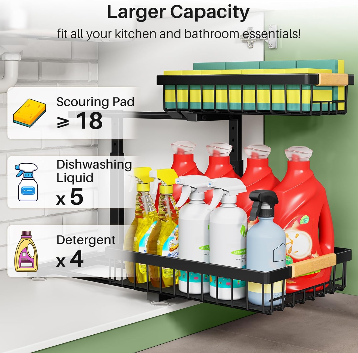 • 2-Tier Sliding Design for Easy Access: This pantry organizers and storage system features a smooth 2-tier sliding design, allowing you to easily reach items stored at the back without bending or kneeling. Perfect for organizing cleaning supplies or toiletries, it’s also a great solution for bathroom organizers and storage, ensuring everything is within reach.