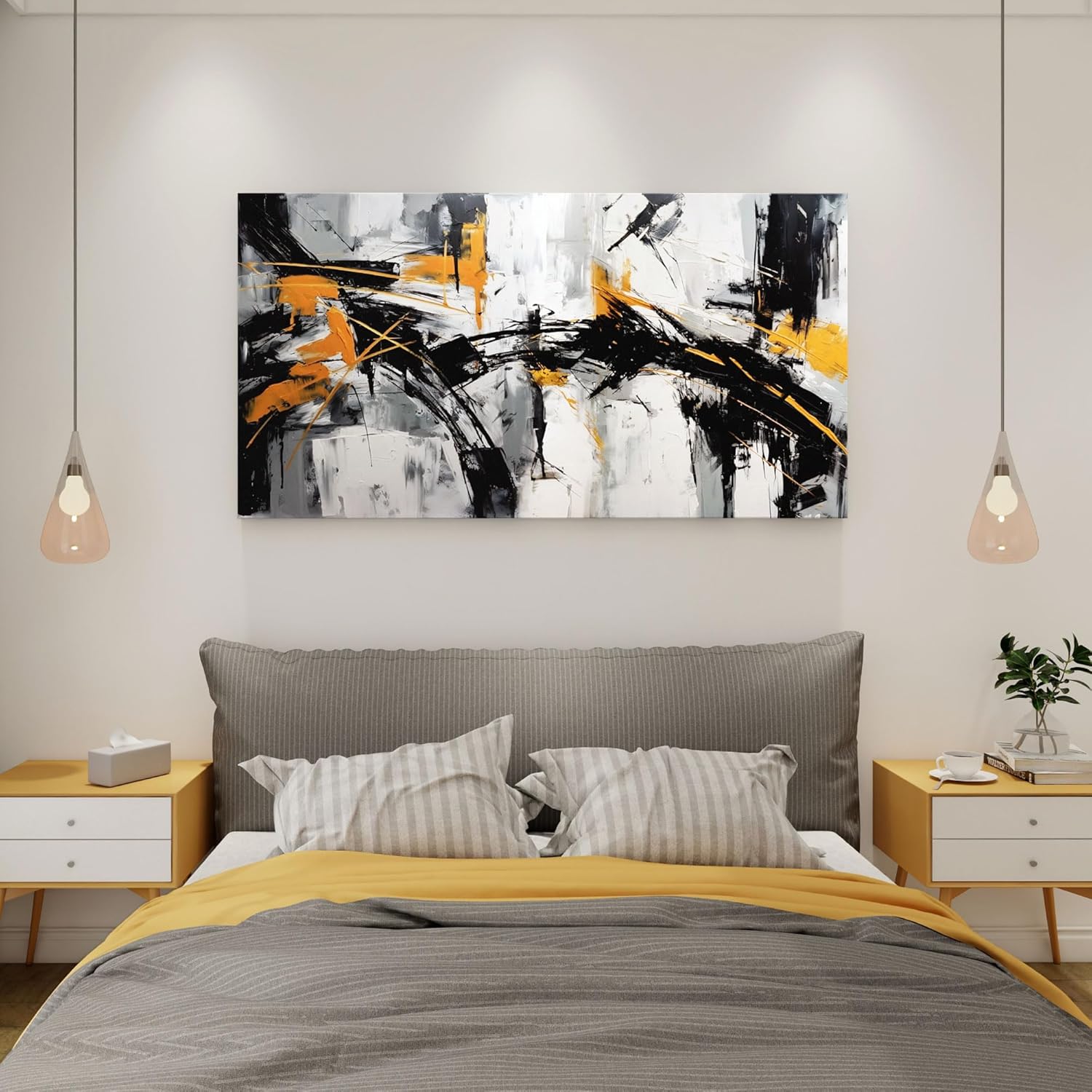Black Abstract Canvas Wall Art Elegant and Modern Orange Wall Art for Living Room - Canvas Wall Decor for Office and Home - Large Framed Artwork for Walls , White, Gray and Unique Orange Accents 48×24in