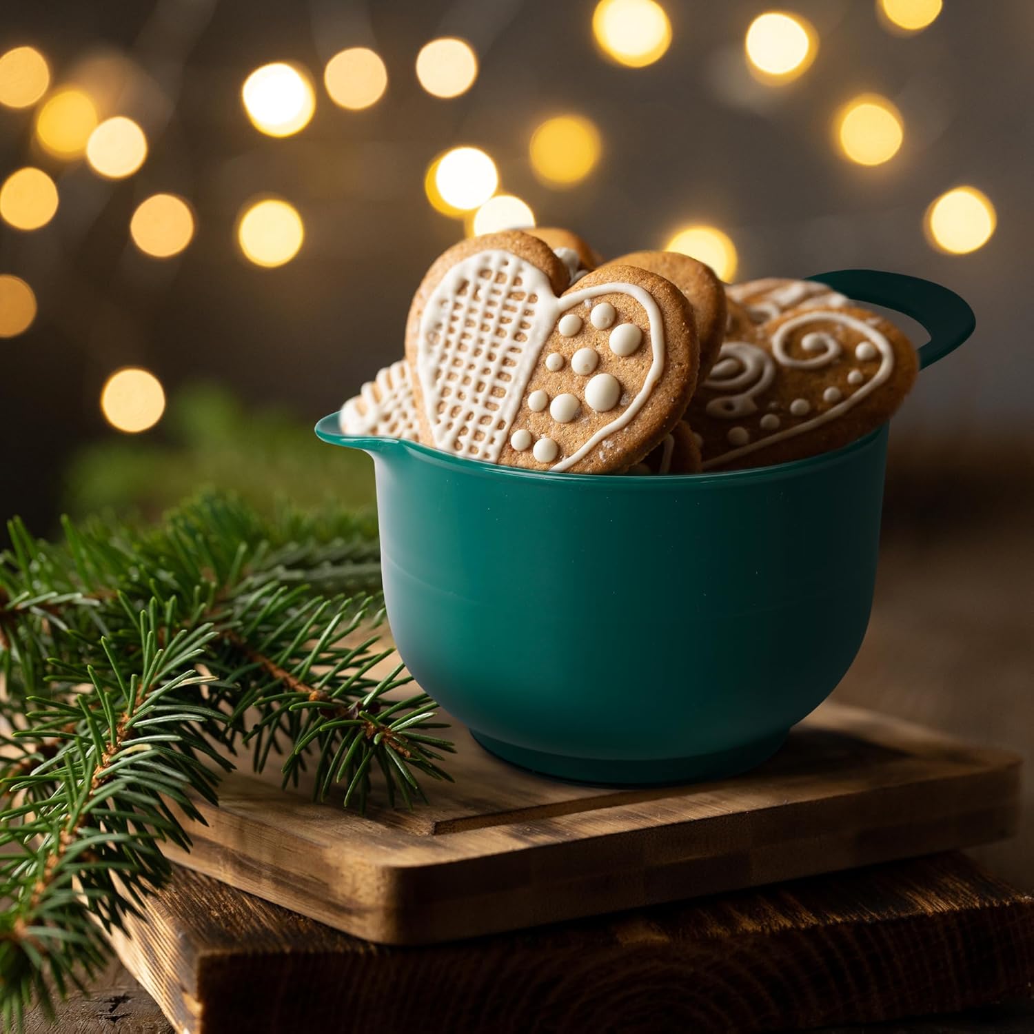 • Mixing Bowl with Handle: Good looking! Smart design for better experience on preparing and organization. Size included: 0.88 Qt, 1.32 Qt, 1.76 Qt and 2.64 Qt. A blue or green silicone scraper is included with the purchase of the Christmas mixing bowl (colours are sent at random and cannot be selected).