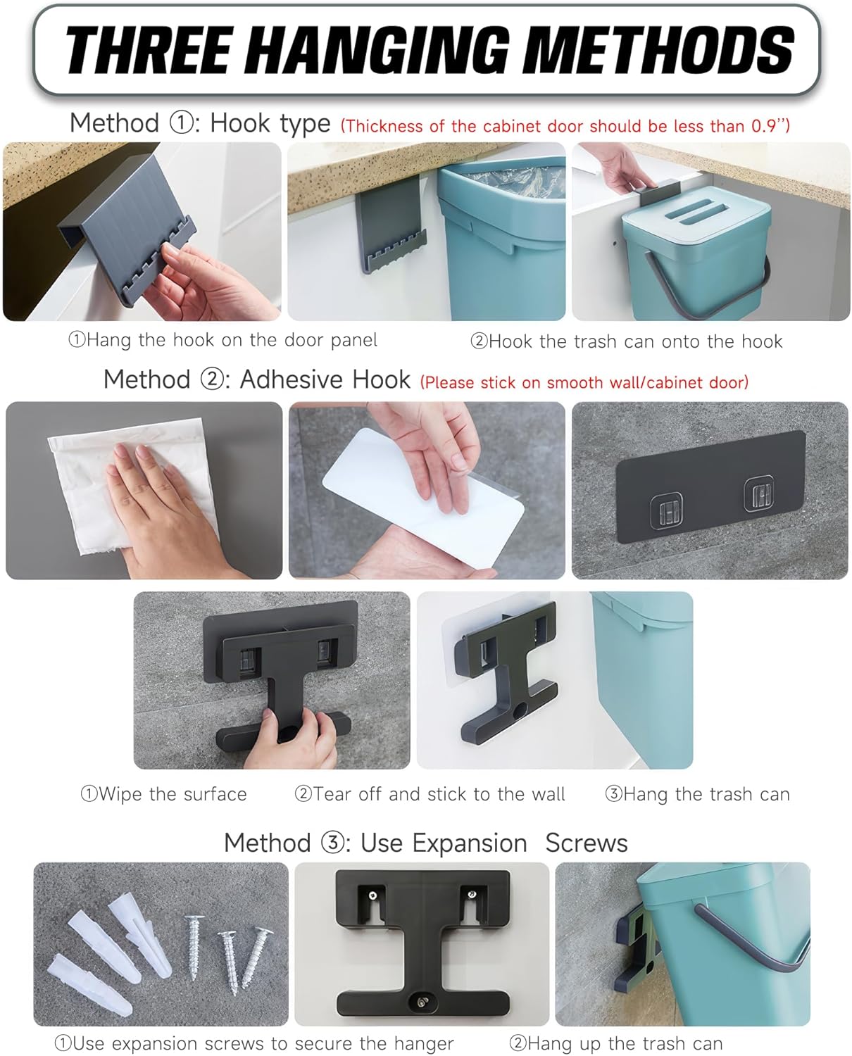 • ✅[Under Sink / Wall Mount Trash Can] Hanging trash is an excellent choice for your daily activities. You can use it while you cook and then store it under the sink. Fit for most cabinet doors, pantry doors, cupboards, under sinks, walls, and countertops.