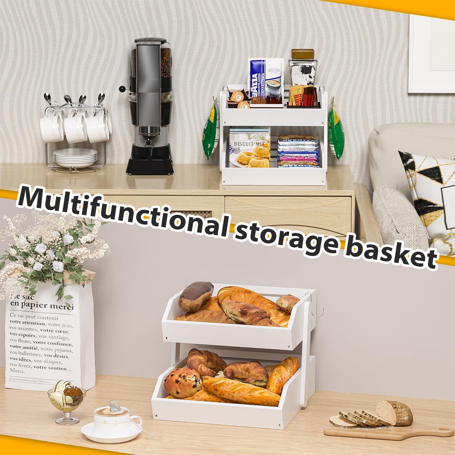 Bamboo Fruit Basket for Kitchen - 2 Tier Fruit Bowl, Large Holder With Banana Hangers, Idea For Vegetable Storage, Bread Display, Snack Organizer (White)