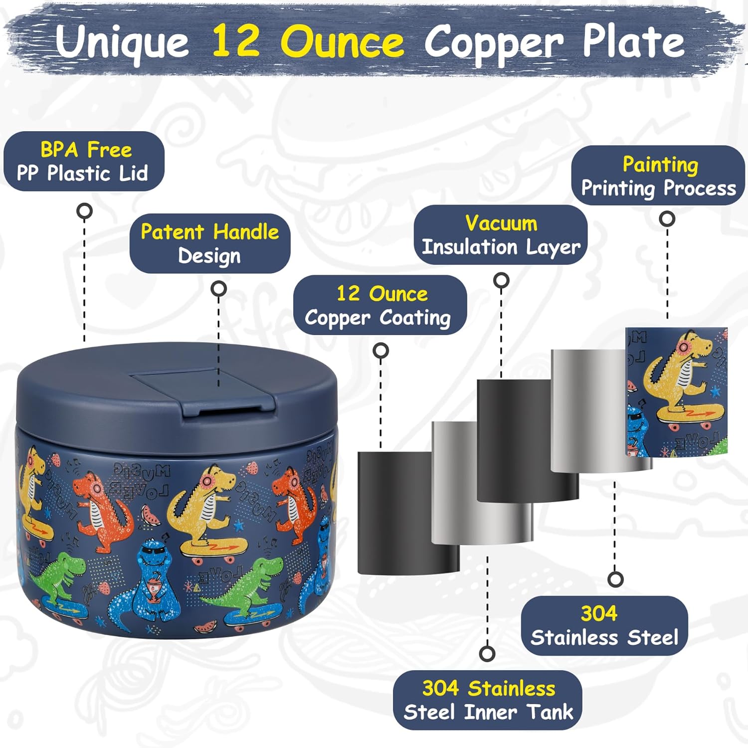12oz Insulated Vacuum Food Jar with Buckle Lid Wide Mouth Soup Thermo for Hot Food Kids Leakproof Stainless Steel Lunch Container (Blue-Dinosaur)