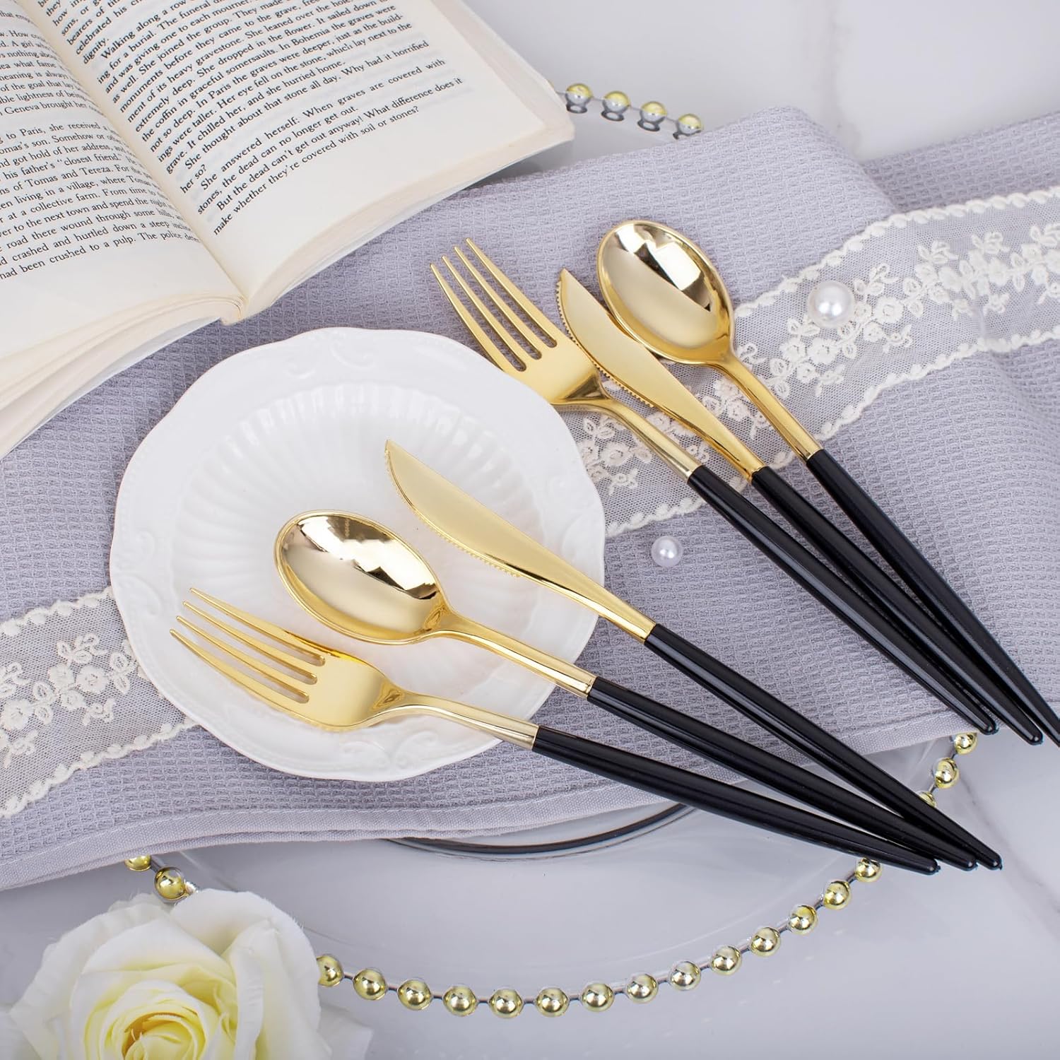 • Premium Quality: Our gold plastic silverware are made from durable hard plastic. The sturdy construction allows for worry-free handling and guarantees a sleek and elegant dining experience. All black and gold plastic silverware are made of 100% food grade, non-toxic, BPA-free plastic.