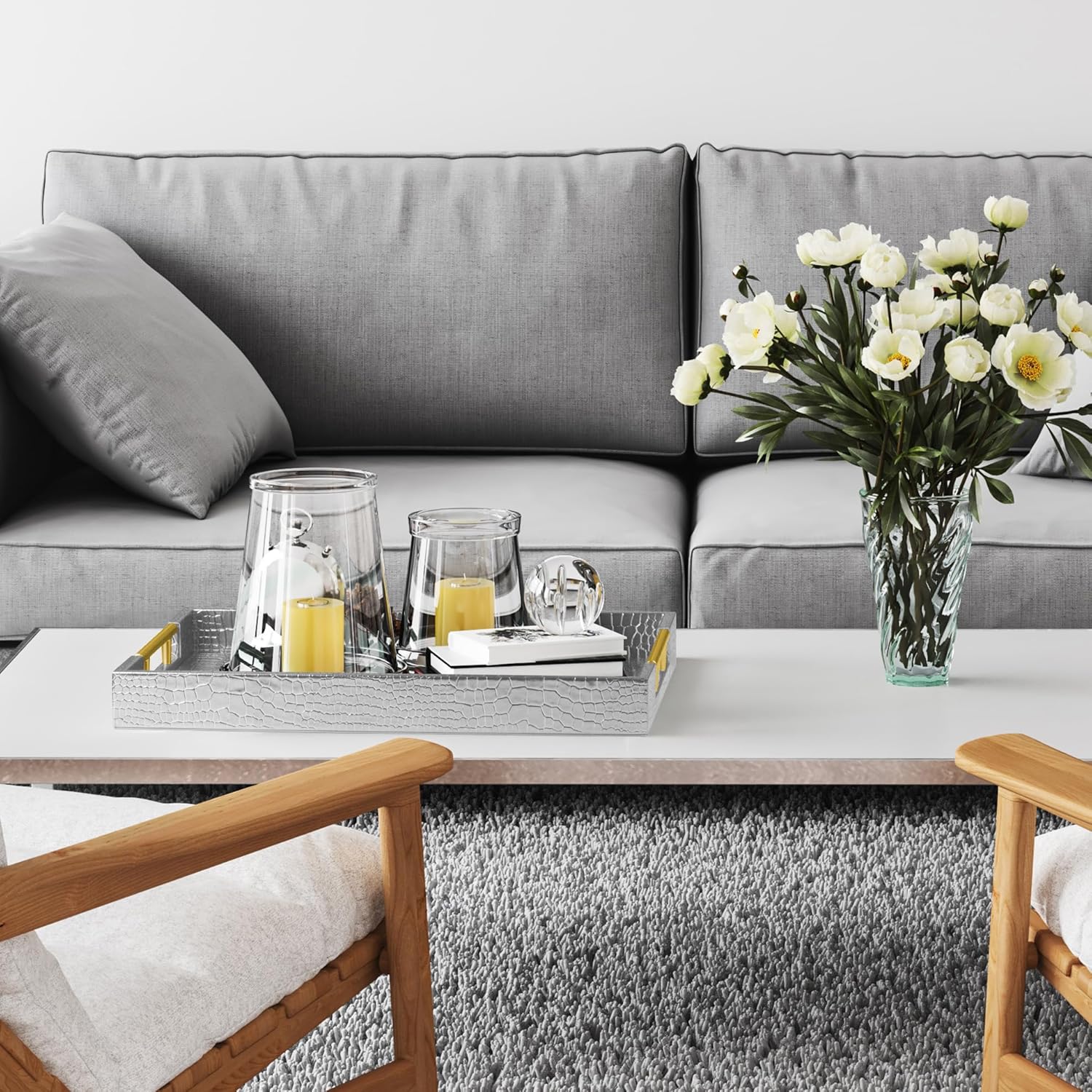 17" x 12" Wood Serving Tray with Gold Polished Metal Handles, Home Decorative Wooden Rectangle Ottoman Leather Decor Platter Bathroom Vanity Tray for All Occasions Alligator Silvery