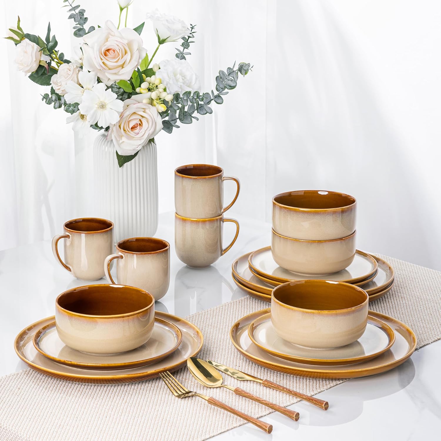 LeRatio Ceramic Dinnerware Sets for 6,Poreclain Plates and Bowls Sets,Handmade Reactive Glaze Dishes Set,Chip Resistant and Scratch Resistant | Oven&Dishwasher & Microwave Safe)-Kahki(18PCS)