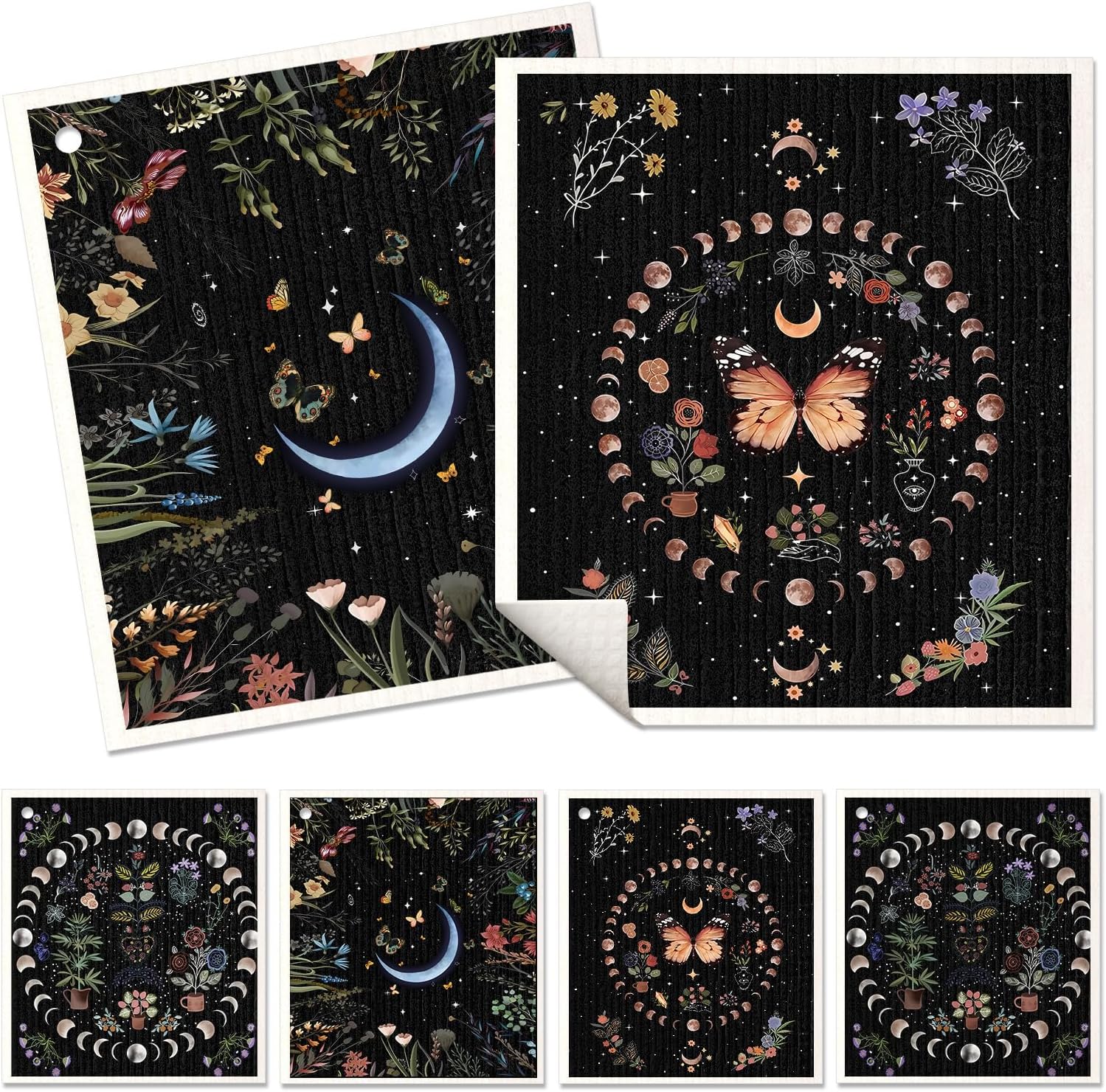 6 Pack Swedish Dishcloths for Kitchen - Reusable Dish Cloths for Washing Dishes Absorbent Cute Funny Kitchen Towels Cleaning Sponge, Moon Butterfly